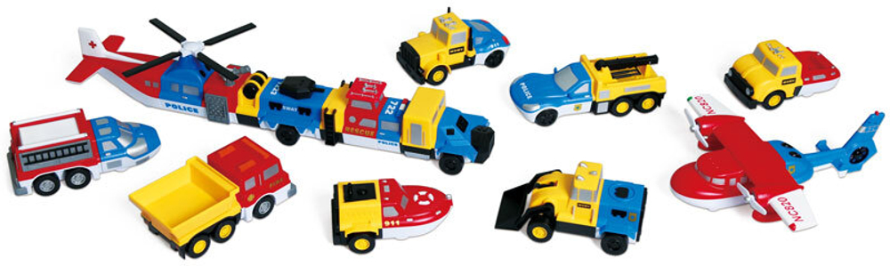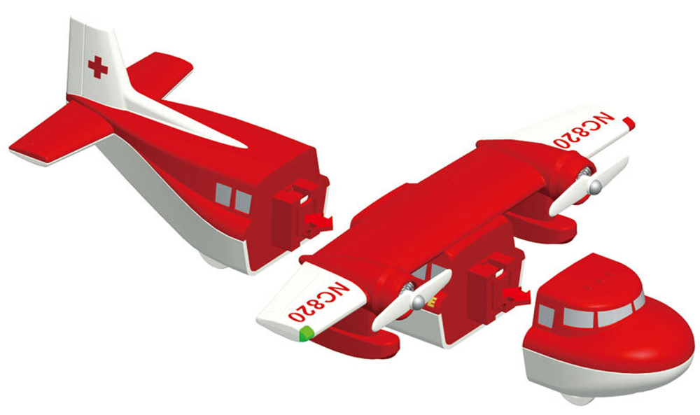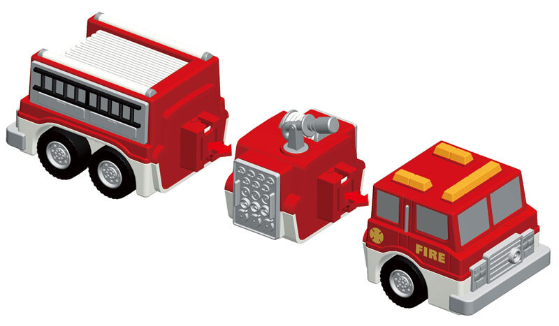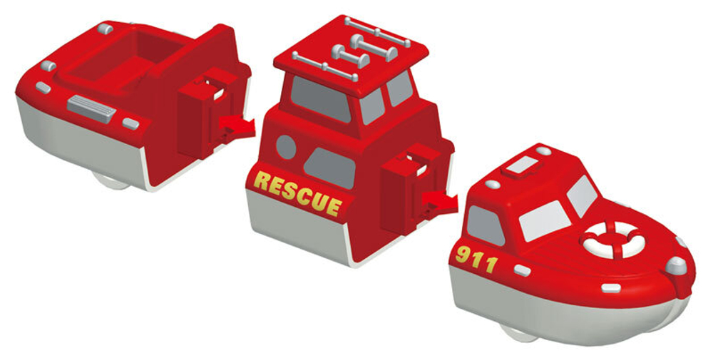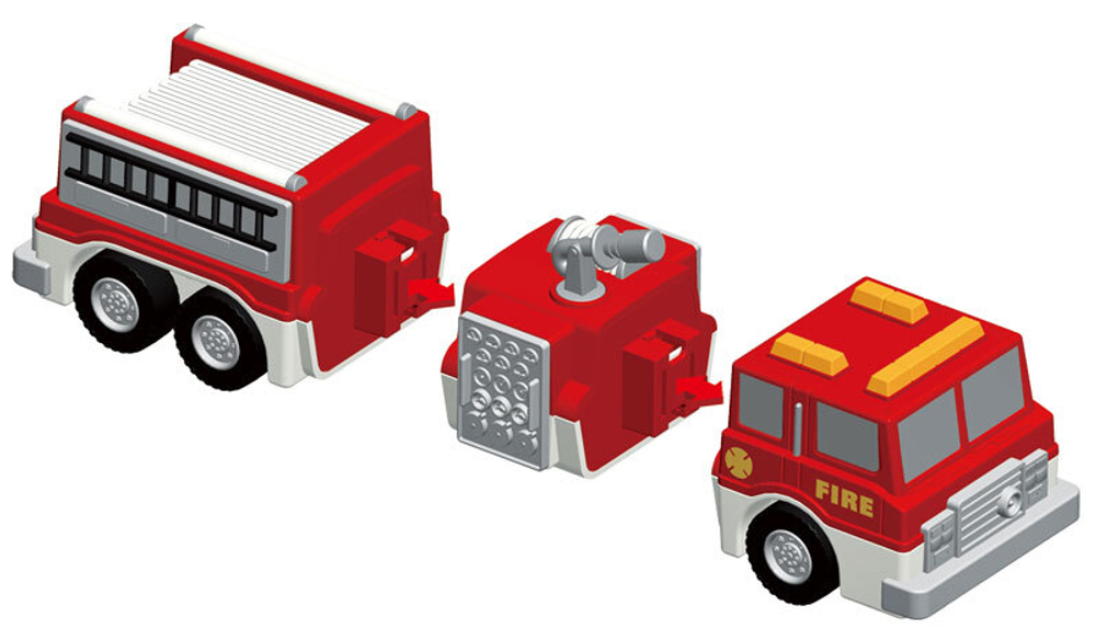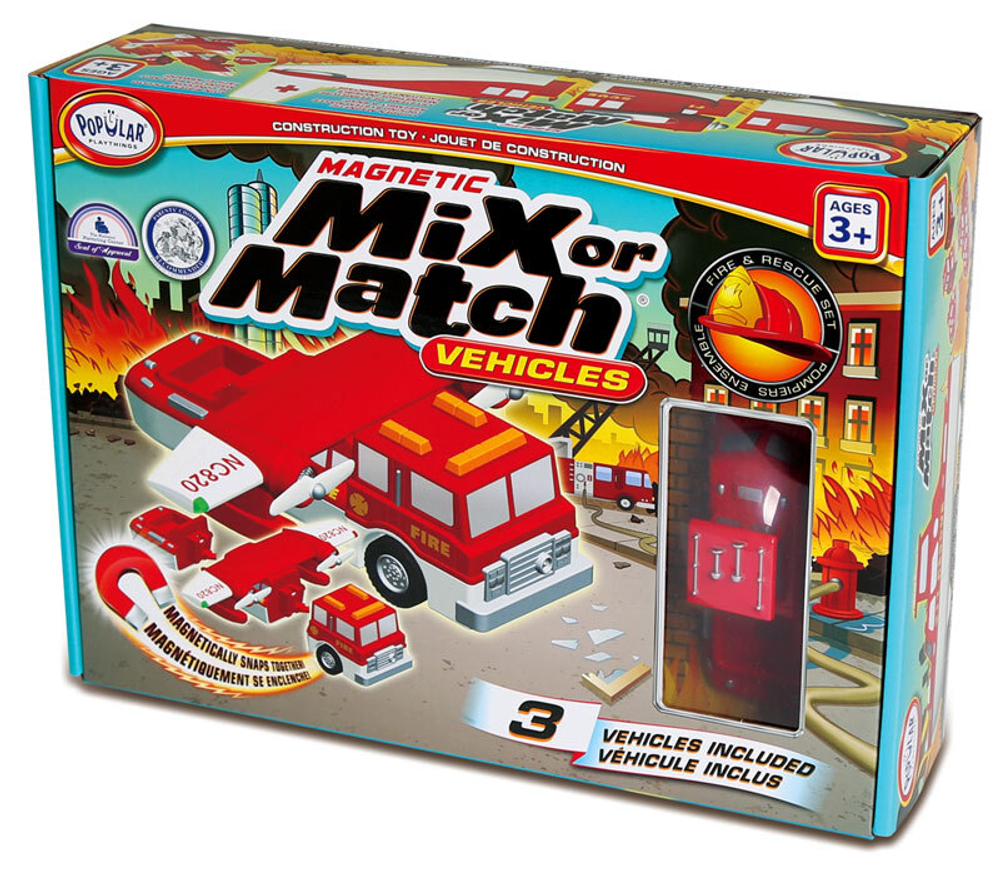 Пожарная машина, корабль, самолёт, состоящие каждый из трёх соединяемых с использованием магнита деталей.