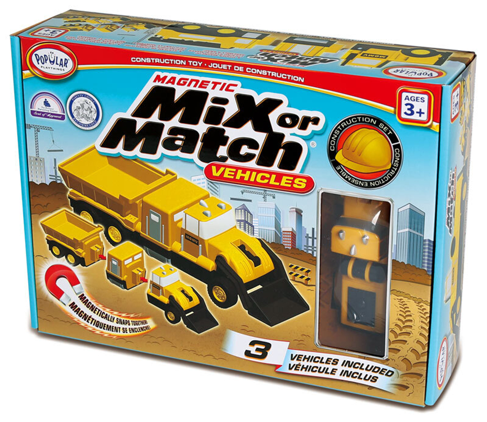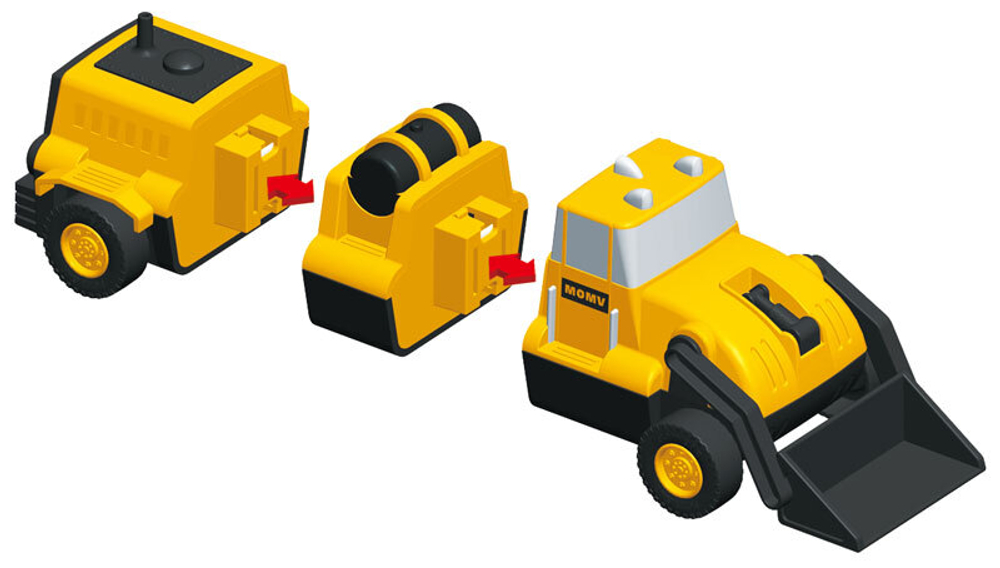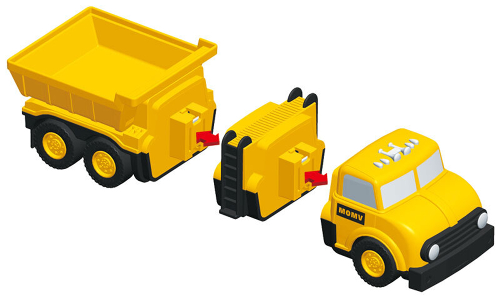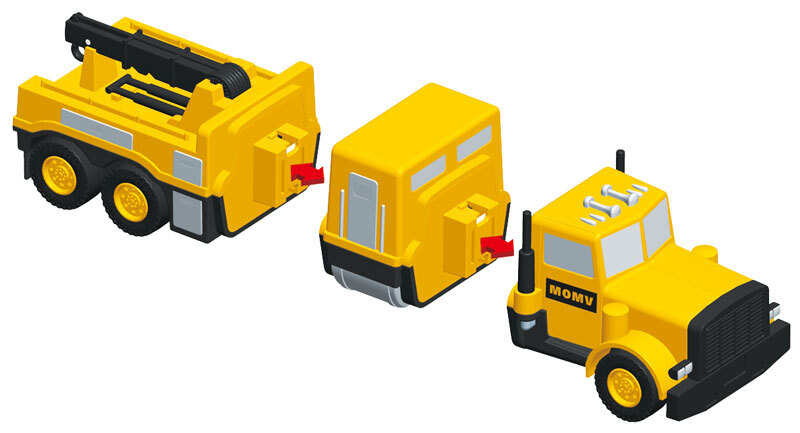 Самосвал, эвакуатор и погрузчик, состоящие каждый из трёх соединяемых с использованием магнита деталей.
