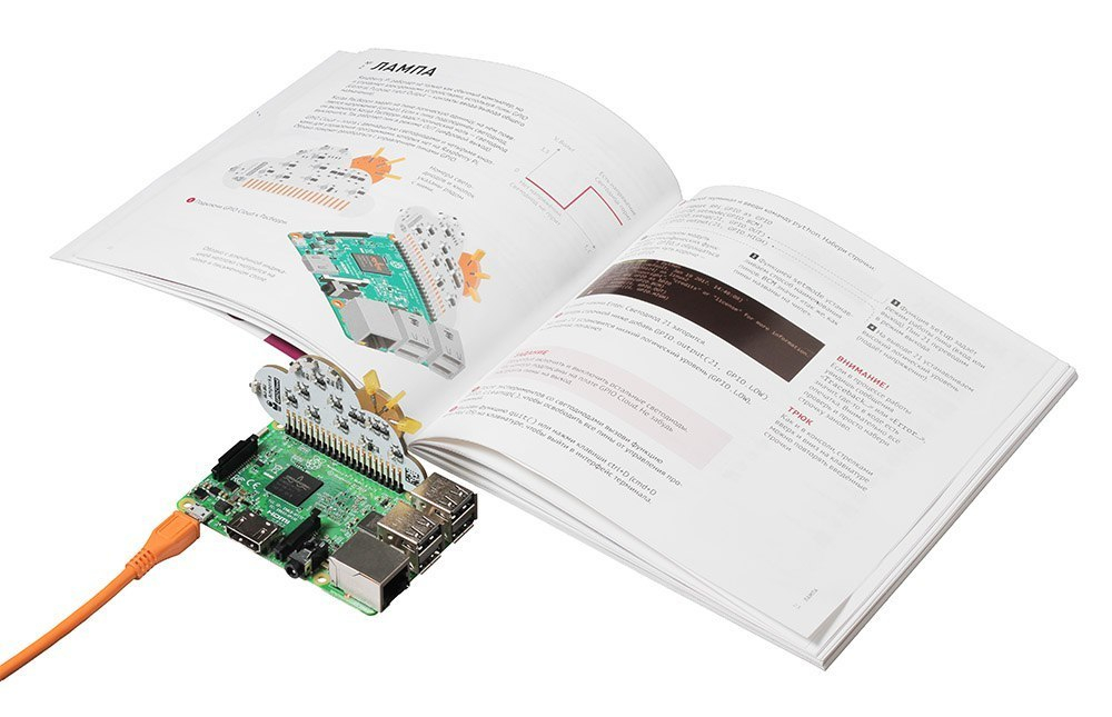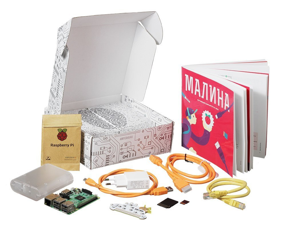Сердце набора – Raspberry Pi 3. Это компьютер размером с банковскую карту. На борту вы найдёте привычные компоненты: процессор, оперативную память, разъём HDMI, композитный выход, четыре USB, Ethernet, и модули беспроводных сетей.