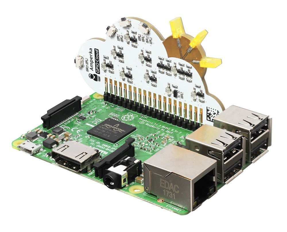 Чтобы не возиться с макетными платами и россыпью радиодеталей, мы придумали электронное облачко. На нём четыре кнопки и дюжина жёлтых и синих светодиодов. Облачко садится на штатные пины GPIO и его элементами можно управлять напрямую из программного кода.