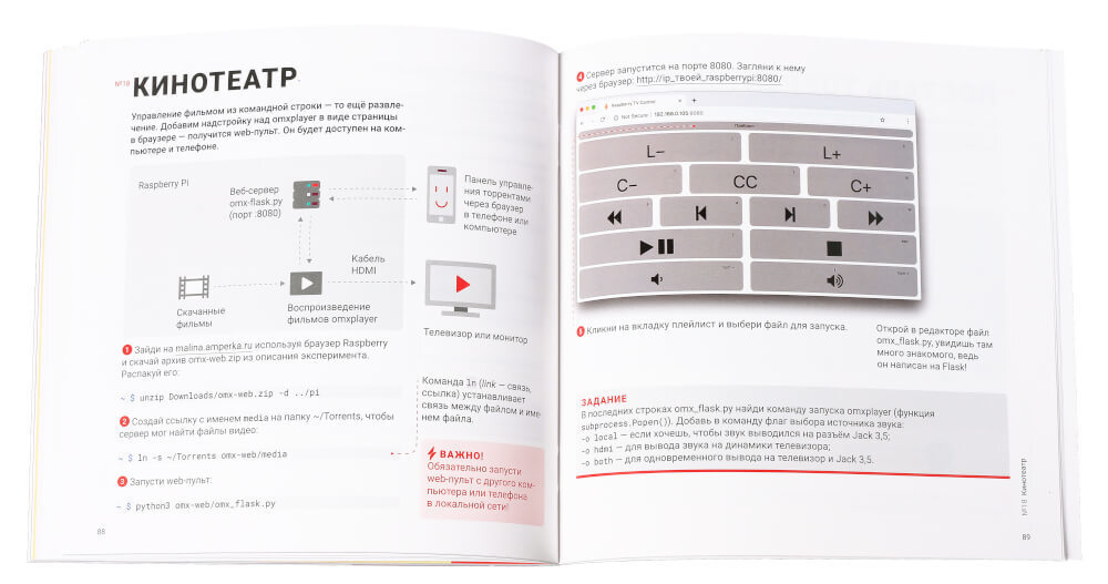 Затем наступит черёд девятнадцати экспериментов, которые научат основам языка Python, помогут освоить web-программирование и собрать медиацентр для домашнего кинотеатра.
