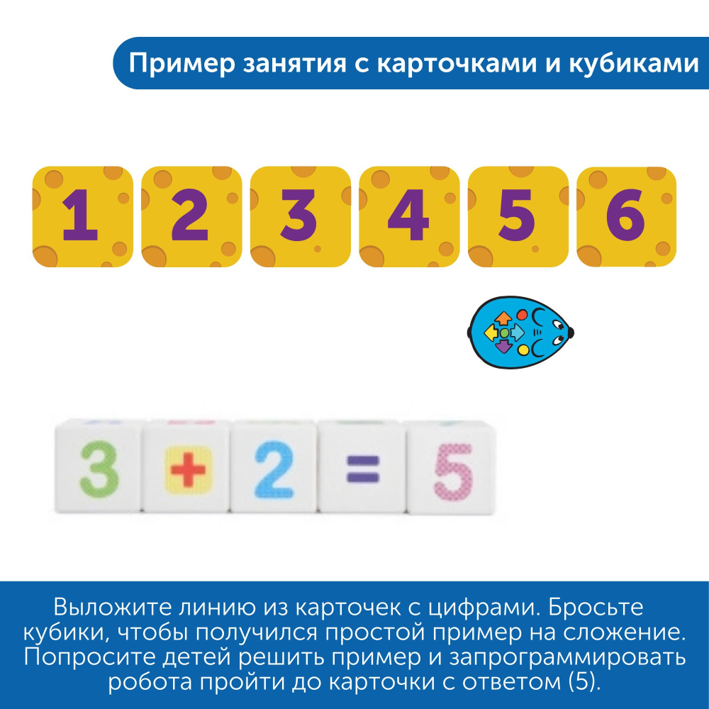 Используя двусторонние карточки, игральные кубики и математические коврики, дети познакомятся с основными принципами кодирования, сложением, вычитанием, последовательностью чисел.