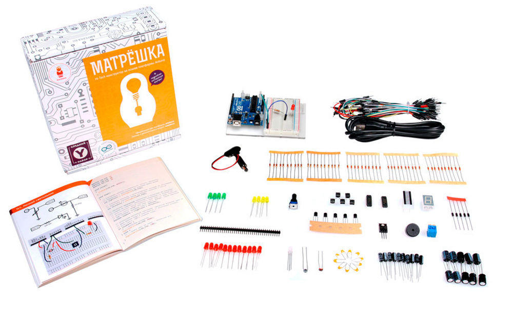 Если вы хотите начать работать с Arduino, но у вас нет опыта и нет базовых радиодеталей и приспособлений, набор «Матрёшка» – это лучший выбор. В нём вы найдёте самую распространённую платформу Arduino Uno, набор радиодеталей, провода, макетную плату, а самое главное – красочную лаконичную обучающую брошюру, которая с нуля научит вас делать собственные электронные устройства.