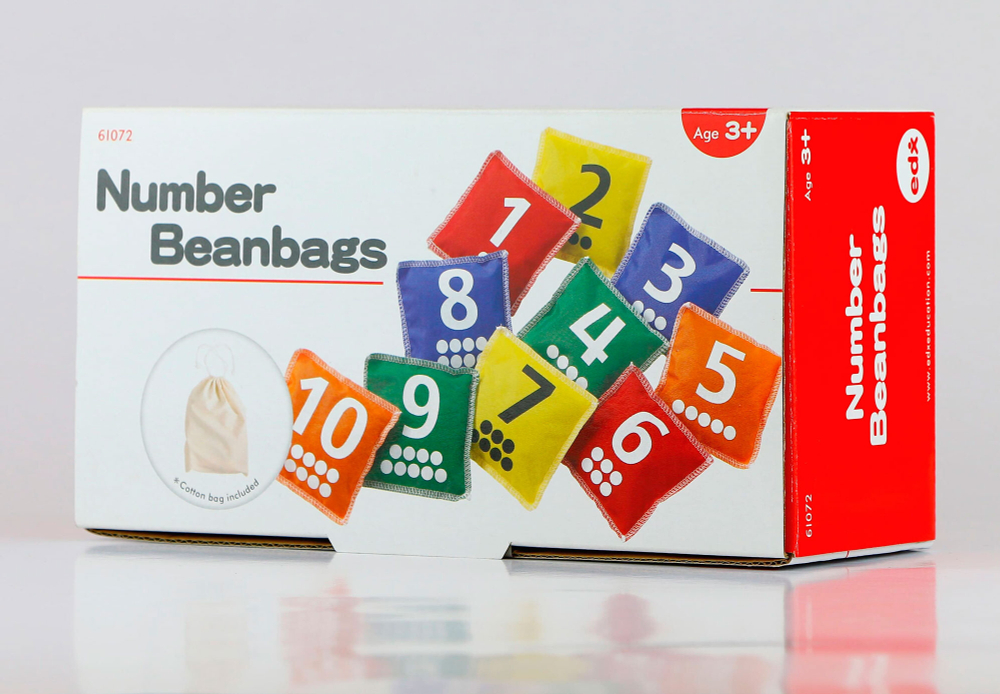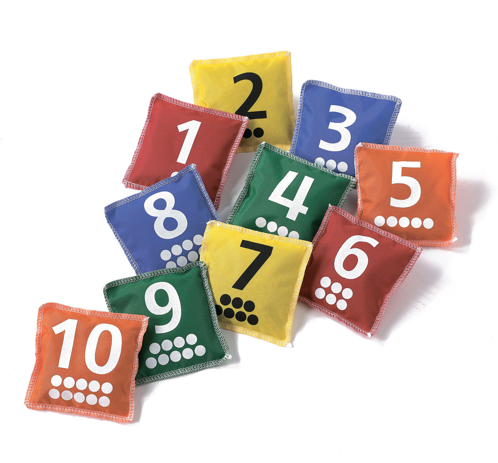 В наборе мешочки с числами от 1 до 10 (с сыпучим материалом внутри) в 5 цветах и сумка для хранения.