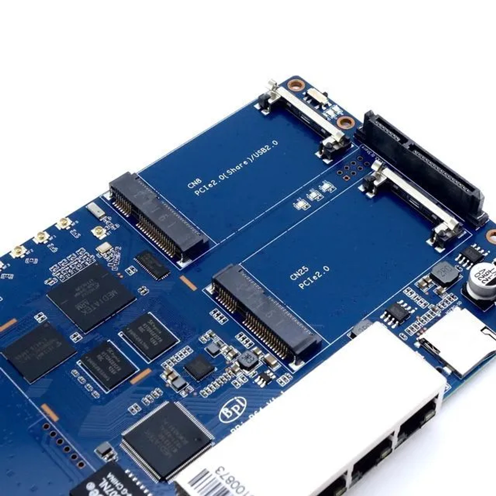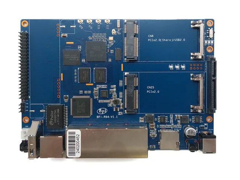 Banana Pi R64 — плата для разработки сетевых решений (маршрутизатор, VPN, межсетевой шлюз, NAS). В основе R64 лежит высокоинтегрированная SoC MediaTek MT7622, объединившая 64-х битный процессор с двумя ядрами ARM Cortex-A53, работающими на частоте 1.35ГГц, Wi-Fi 802.11n с поддержкой режима 4х4, Bluetooth 5.0, расширенный набор интерфейсов, включая SGMII/RGMII, PCIe и USB, а также ряд уникальных технологий, обеспечивающих аппаратное ускорение сетевых операций, обмена данными (SATA 3.0/eSATA Gen2) и вычисления HNAT HQoS, простую настройку, возможность самовосстановления сетевого подключения, интеллектуальное управление роумингом, диапазоном, QoS, безопасностью и многое другие.
