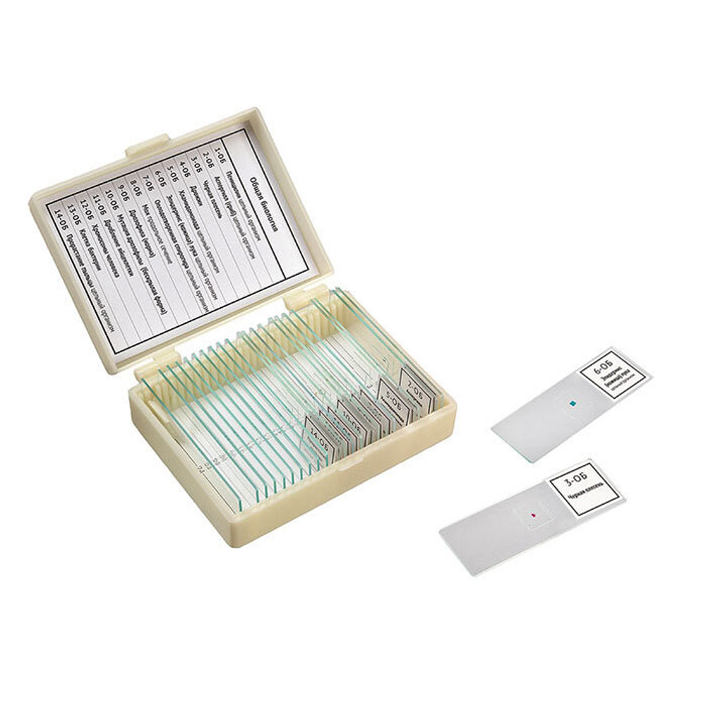 Набор готовых препаратов для проведения исследований на учебном биологическом микроскопе проходящего света. Для школьного возраста.