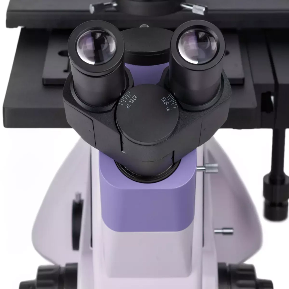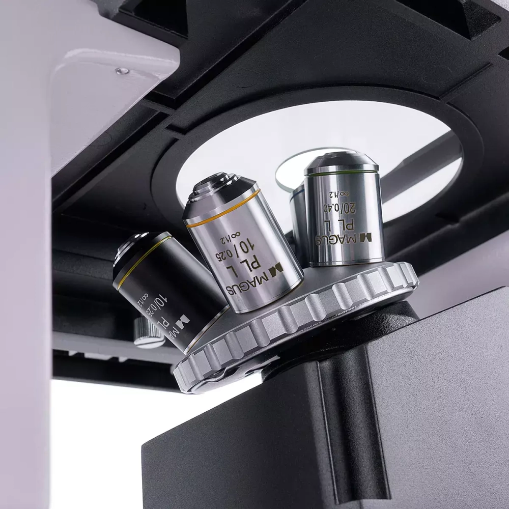 Микроскоп оснащен тринокулярной визуальной насадкой, которую при сборке микроскопа можно развернуть на 180°, чтобы адаптировать ее под необходимую высоту. Микроскоп оборудован двумя каналами визуализации: один вертикальный, расположен на корпусе и используется для установки монитора, второй встроен в корпус и нужен для установки цифровой камеры. Револьвер с 5 гнездами находится под исследуемым образцом. В комплекте четыре планахроматических объектива с расчетом на бесконечность: три из них предназначены для светлопольных наблюдений, один – для фазового контраста.
