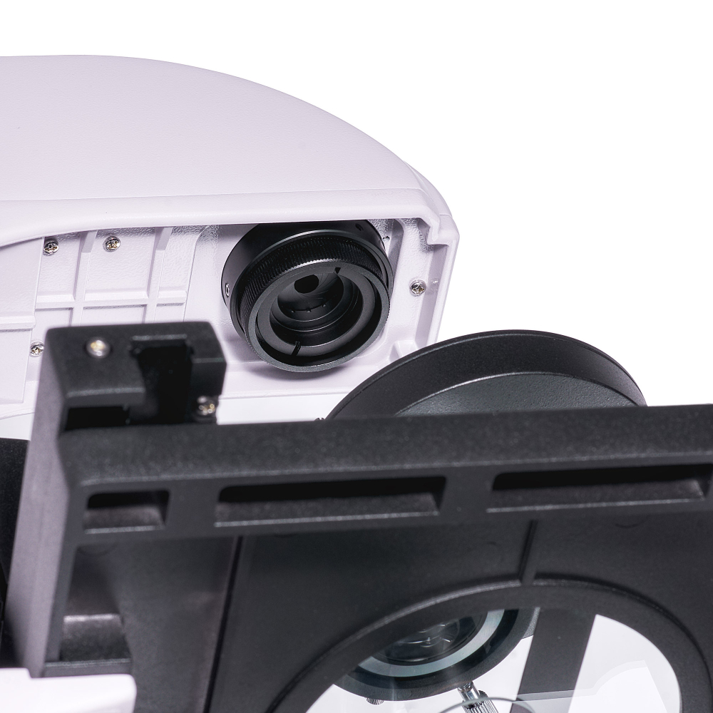 Монитор устанавливается в вертикальный тубус визуальной насадки, а цифровая камера в боковой канал визуализации на корпусе микроскопа. Световой поток на тринокулярной насадке переключается 50/50 (канал визуализации открыт) или 100/0 (канал визуализации закрыт), на корпусе – 100/0 или 0/100.