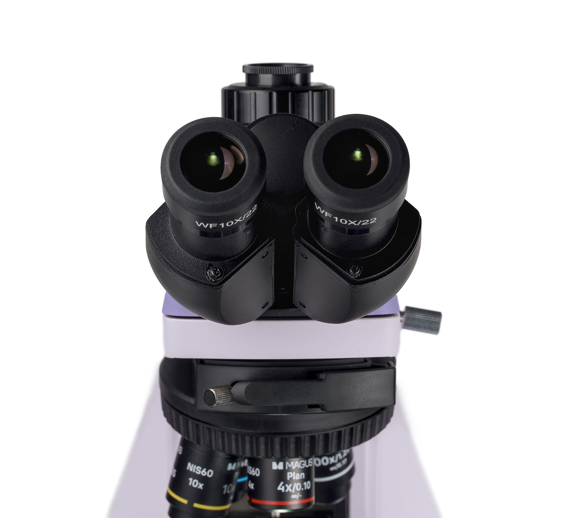 Микроскоп оснащен визуальной насадкой с двумя окулярными трубками и каналом визуализации. Трубки вращаются на 360°, с их вращением настраивается высота выходного зрачка: пользователь может отрегулировать его под себя. Тубусы комплектуются окулярами 10х/22 мм с системой диоптрийной подстройки: на самих тубусах колец настройки нет. Плоские наглазники из резины пригодятся тем, кто носит очки: они уберегут линзы очков от повреждений. Канал визуализации предполагает установку камеры, распределение света происходит в соотношении 50/50.