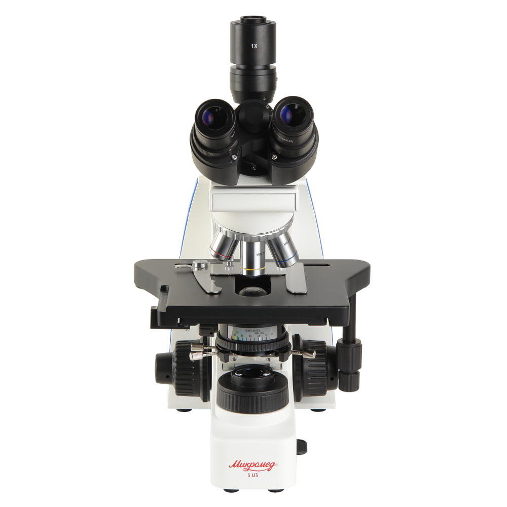 Револьверное устройство на 5 объективов, в комплекте четыре планахроматических объектива 4x/0.13; 10x/0.25; 40x/0.65; 100x/1.25 (oil) с коррекцией на толщину покровного стекла 0,17 мм. Дополнительно можно приобрести объектив, который лаборант выберет из линейки объективов, в зависимости от задачи наблюдений – 2х/0,06; 20х/0,45; 60х/0,80.