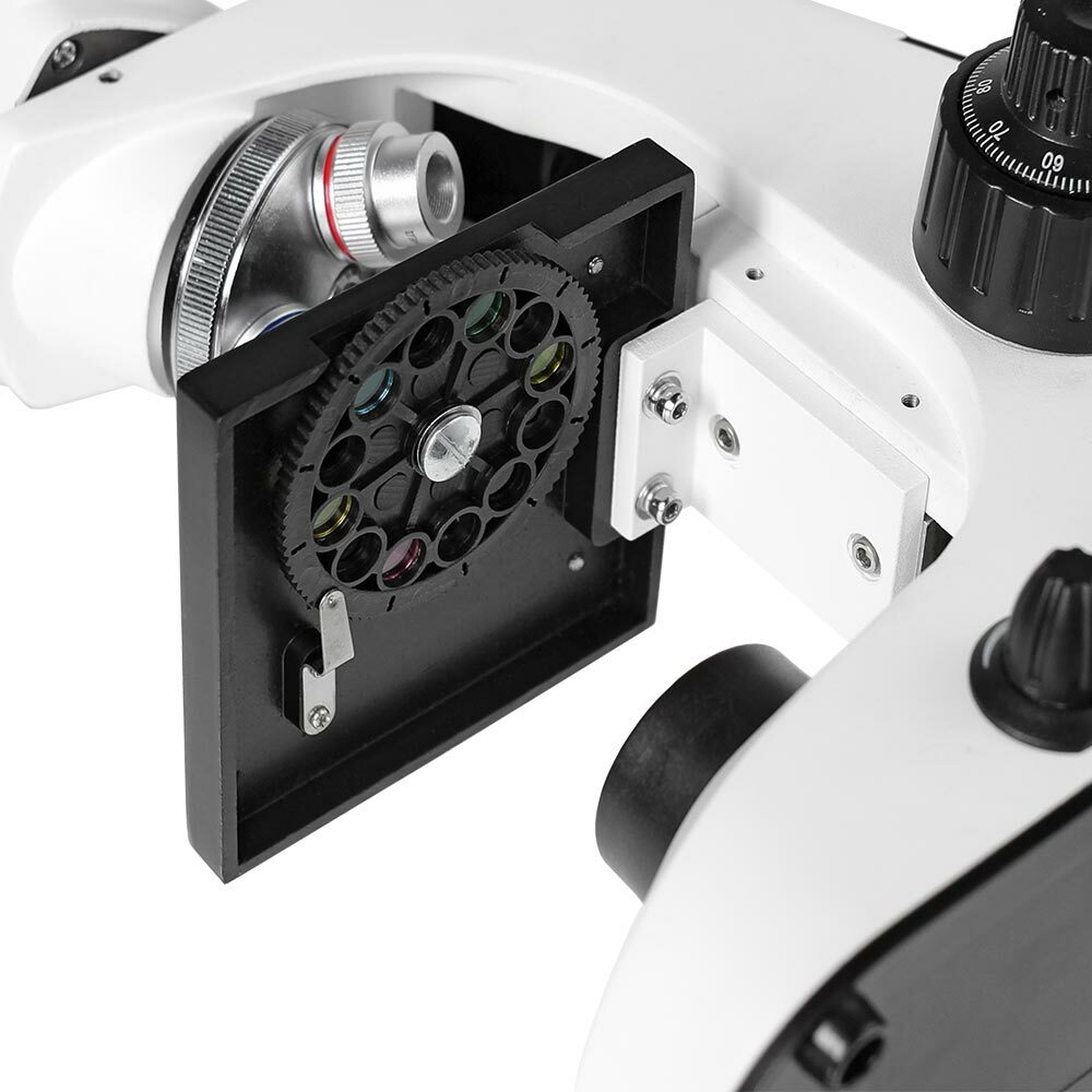 Микроскоп Микромед С-11(вар. 1В LED) имеет два осветителя на светодиодах для проходящего и отраженного света. Осветитель проходящего света дополнен поворотный диск с 12 отверстиями различных диаметров – они выполняют функцию апертурной диафрагмы и служат для повышения контраста при использовании объективов различных увеличений. В 5 отверстий встроены цветные светофильтры. Их назначение также заключается в повышении контраста видимого изображения. Поворотный диск размещается внизу предметного столика.