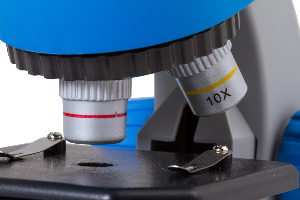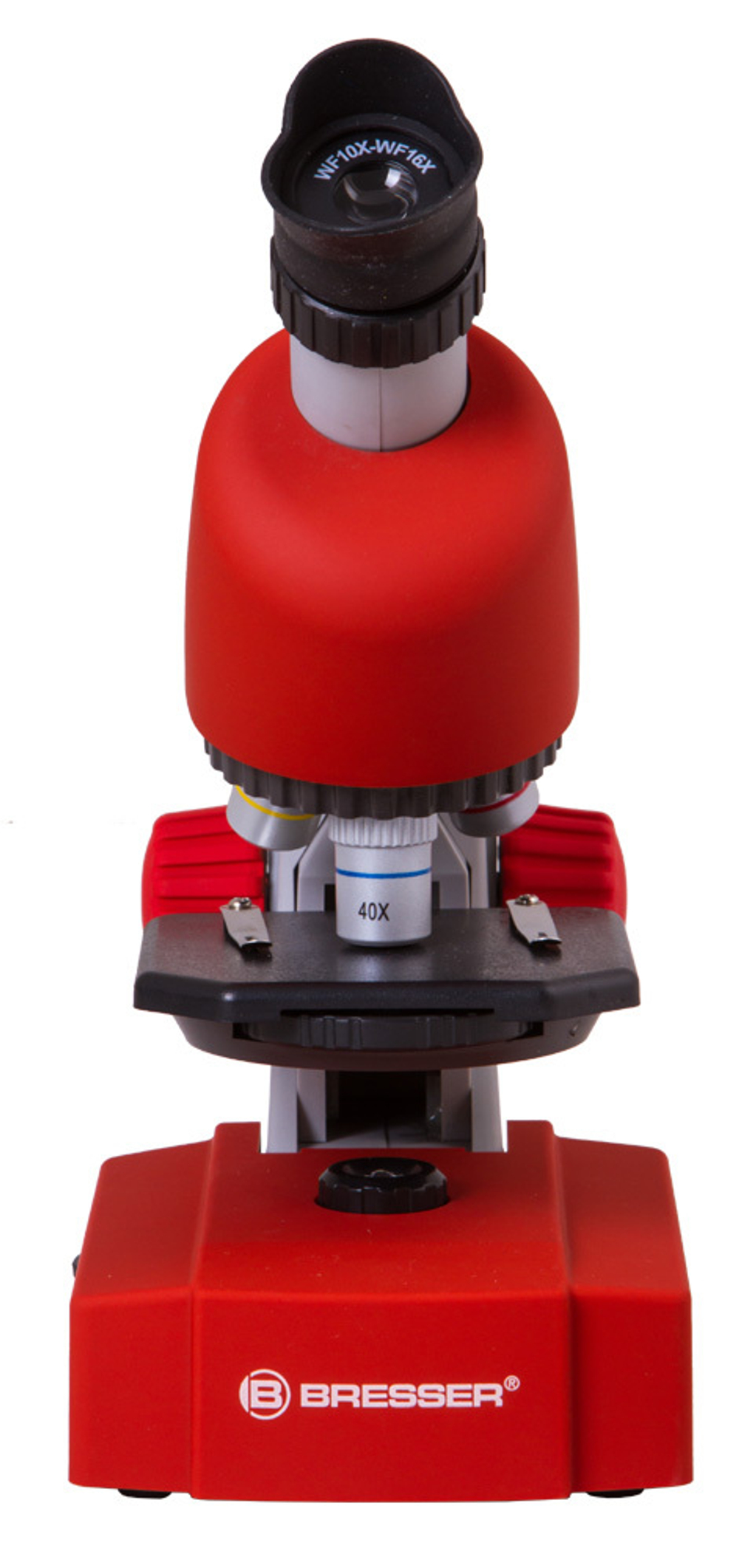 Микроскоп Bresser Junior 40x-640x позволяет рассматривать образцы на увеличении от 40 до 640 крат. Он имеет револьверное устройство на три объектива (4х, 10х и 40х) и двухпозиционный окуляр, который может менять кратность с 10х на 16х. Такая система увеличений позволяет исключить из схемы работы с прибором дополнительные оптические аксессуары и делает механику микроскопа более простой и понятной для ребенка.