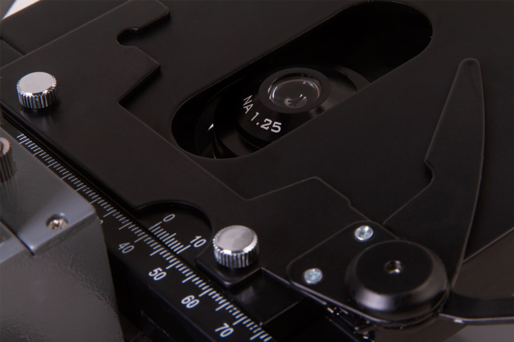 Револьверное устройство вмещает 4 объектива. Благодаря ахроматической оптике они передают четкое и контрастное изображение без искажений. 100-кратный объектив можно использовать для проведения наблюдений иммерсионным методом – флакон со специальным маслом включен в комплект поставки.
