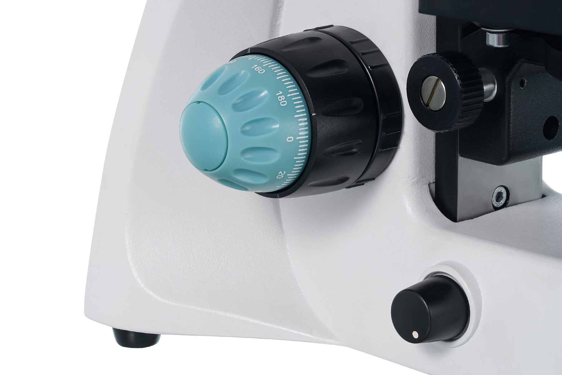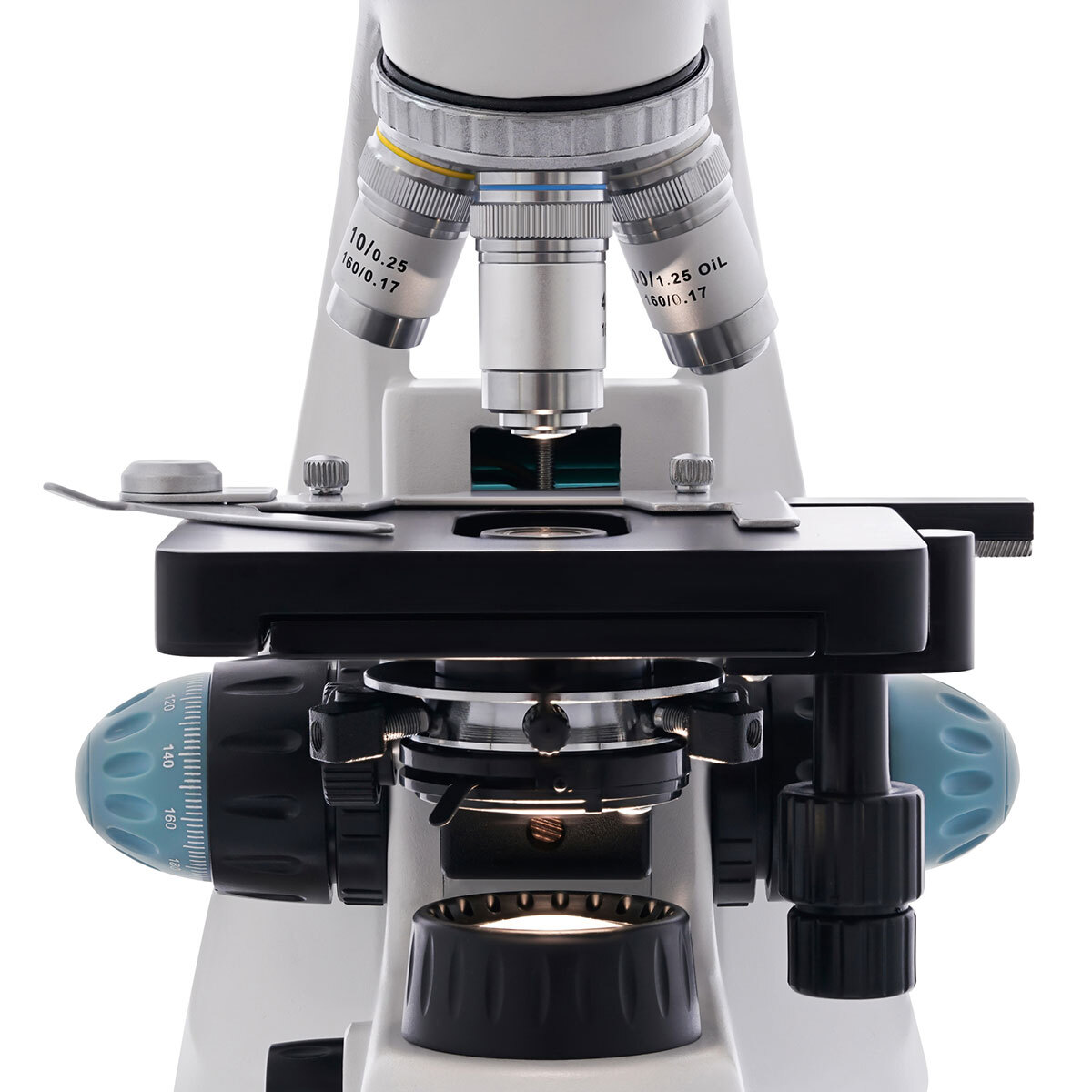 Предметный столик снабжен препаратоводителем. Прямо под столиком находится регулируемый по высоте конденсор Аббе с ирисовой диафрагмой. Для установки светофильтра предусмотрен специальный держатель. Подсветка – это галогенная лампочка и коллектор, она работает от сети переменного тока. Яркость подсветки можно регулировать.