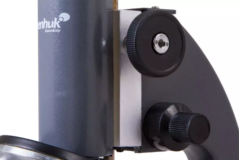 Все оптические элементы микроскопа сделаны из стекла и помещены в прочный металлический корпус. Револьверное устройство рассчитано на три объектива и легко вращается. Монокулярная насадка позволяет менять окуляры для получения подходящего увеличения. Предметный столик снабжен стандартными препаратодержателями, а настройку резкости можно проводить при помощи ручек грубой и точной фокусировки.