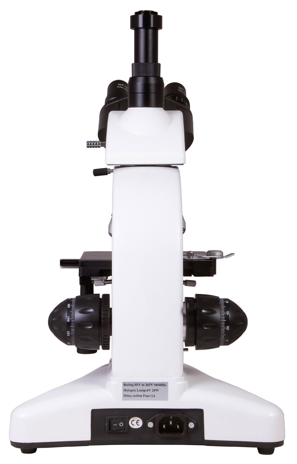Увеличение: 40–1000 крат. Тринокулярная насадка, полупланахроматические объективы, конденсор Аббе с ирисовой диафрагмой и держателем фильтра.