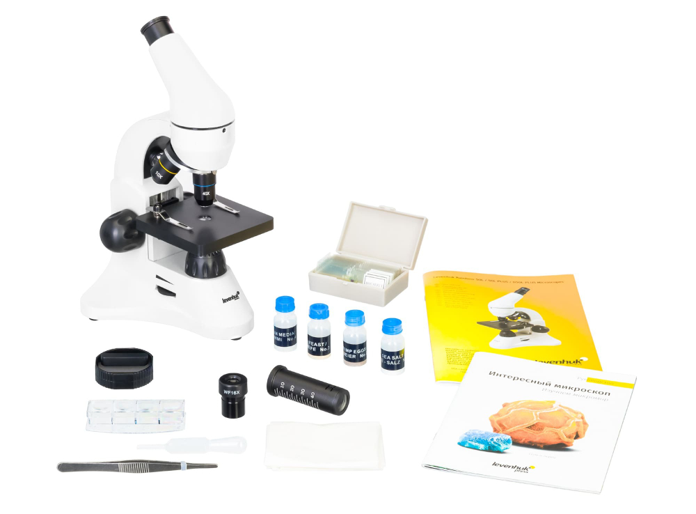 В комплект входит набор Levenhuk K50, в котором есть все, что нужно для проведения интересных опытов с микроскопом. Для начала лучше изучить готовые препараты, а затем – приступить к созданию собственных образцов для исследования. В руководстве содержится полезная информация об устройстве микроскопа, рекомендации по работе с прибором и описания экспериментов.
