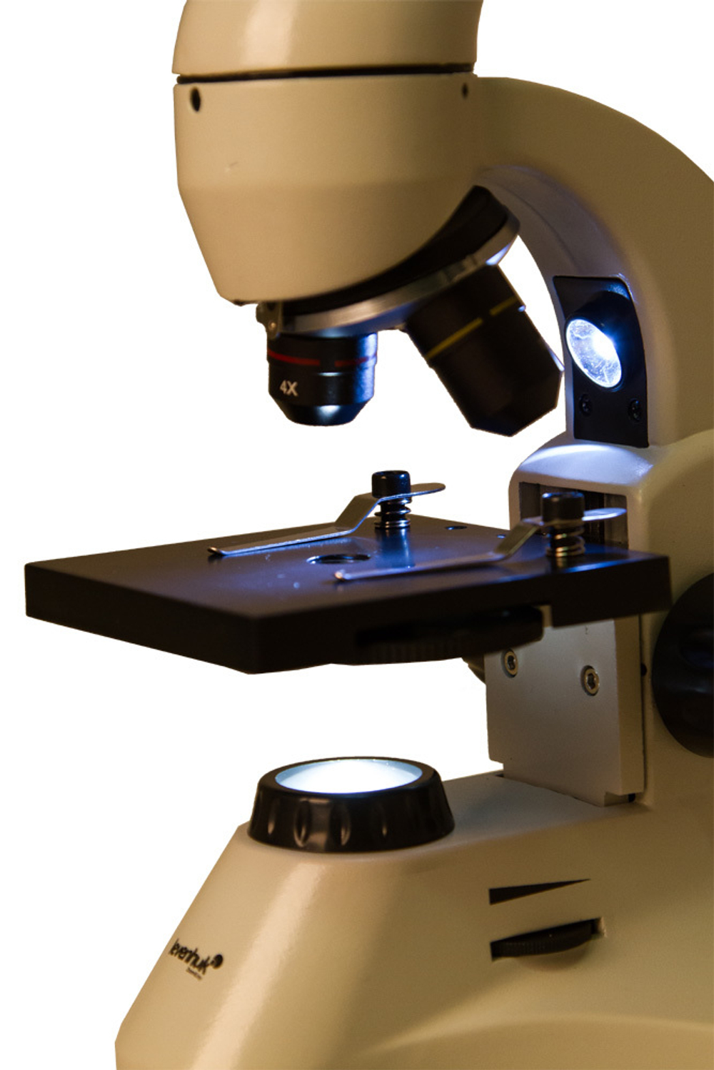 Микроскоп снабжен двумя встроенными осветителями. Нижняя подсветка нужна для исследования прозрачных объектов на просвет – так можно обнаружить жизнь в капле воды или изучить клеточное строение растений. Для работы с непрозрачными образцами – бумагой, тканью, камнями – используется верхний осветитель. Полупрозрачные препараты хорошо различимы, когда включены сразу обе подсветки. Яркость светодиодов регулируется, поэтому для каждого препарата легко настроить оптимальный уровень освещения.