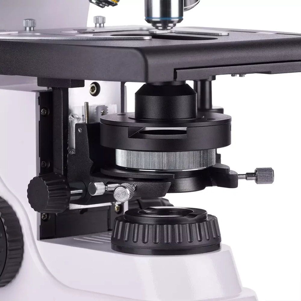 Нижний осветитель, отвечающий за проходящий свет, – галогенная лампа 30 Вт. Ее свет комфортен для глаз, поэтому длительная работа за микроскопом не перенапрягает зрение. Светлопольный конденсор позволяет точно регулировать световой пучок от осветителя и имеет специальный слот, в который можно установить слайдер темного поля или фазовый слайдер. Слайдер (вставка) – простой в применении аксессуар, с помощью которого на микроскопе получают доступ к новым методам исследования с минимальными затратами.