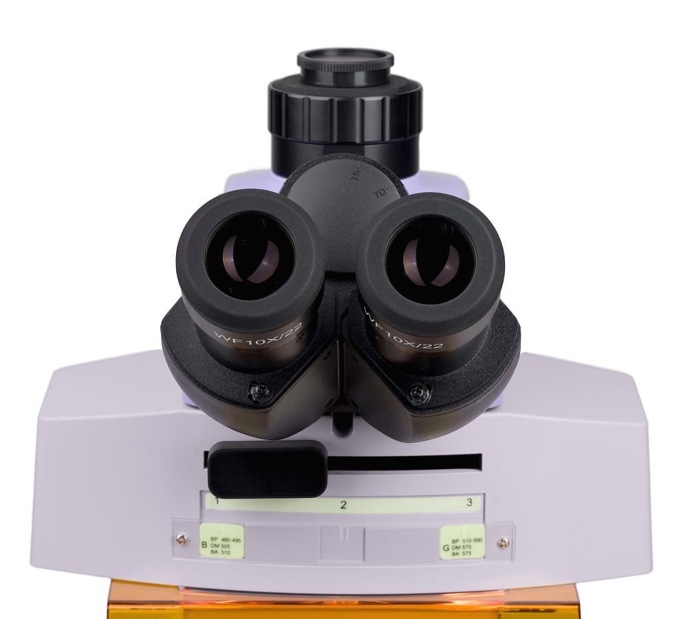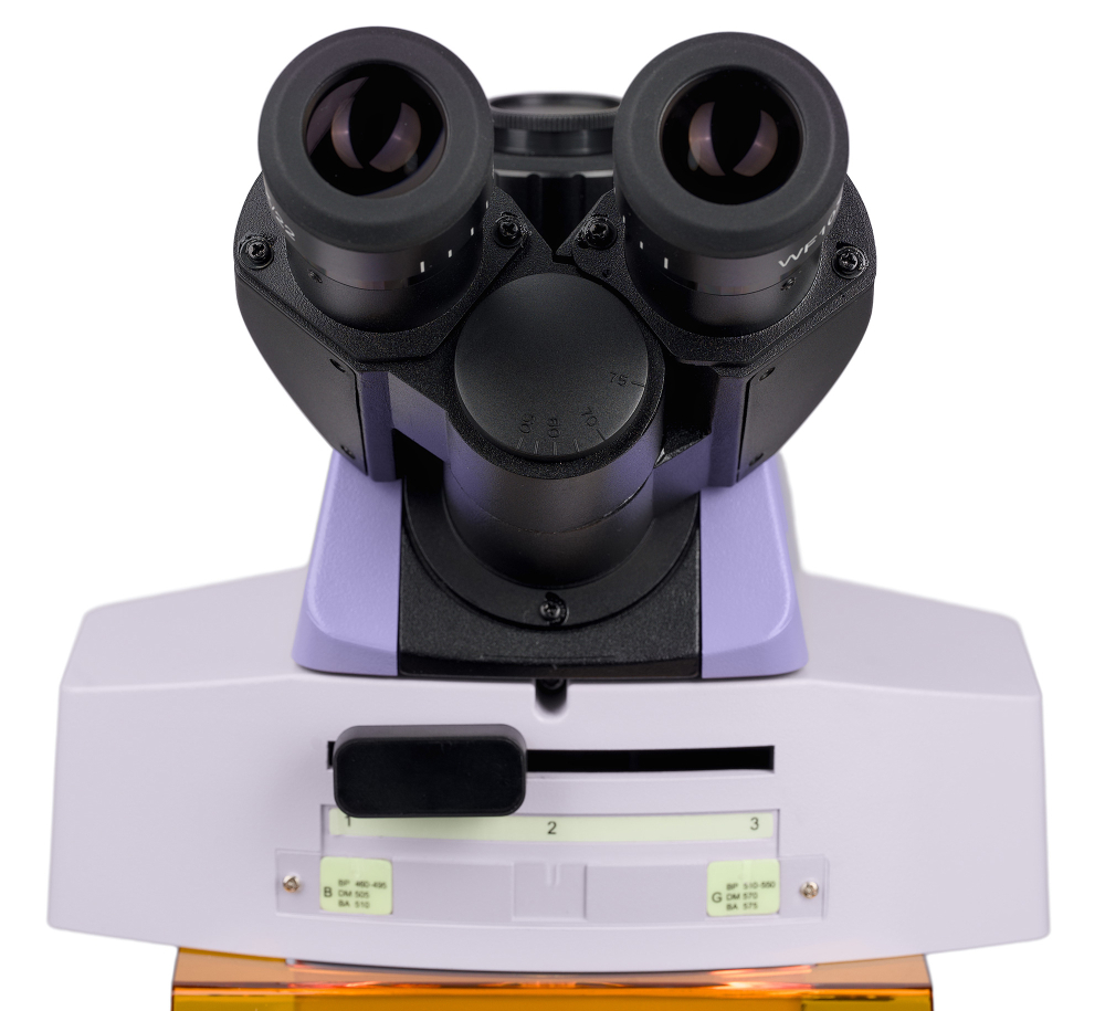 Для работы в люминесцентном свете микроскоп имеет осветитель отраженного света. Светодиоды в этом осветителе тоже 3-ваттные, такой осветитель безопасен и не требует дополнительного ухода. Он не нагревается, быстро достигает нужной яркости и быстро выключается. Переключение из одного режима работы в другой осуществляется с помощью переключателя в люминесцентной насадке: положение посередине обеспечивает работу в светлом поле, при повороте переключателя вправо или влево выбирается рабочий фильтр – синий (B) или зеленый (G). При установленном синем фильтре объект производит желто-зеленое люминесцентное свечение, при зеленом фильтре – красное.