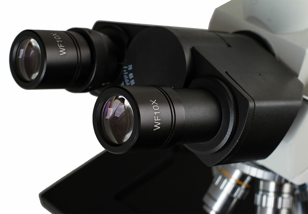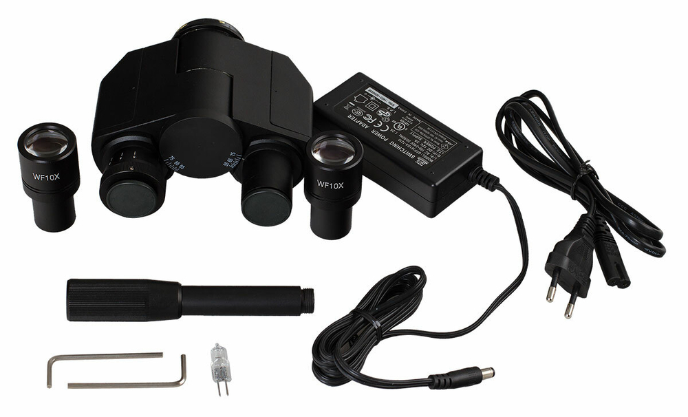 В комплект входят 5 планахроматических объективов, которые дают увеличения в диапазоне от 50 до 800 крат. 5-гнездное револьверное устройство позволяет оперативно выбирать нужное увеличение, не отрываясь от работы. Тринокулярная насадка обеспечивает удобную работу с микроскопом и возможность фиксировать результаты исследований (требуется подключение камеры, в комплект не входят).