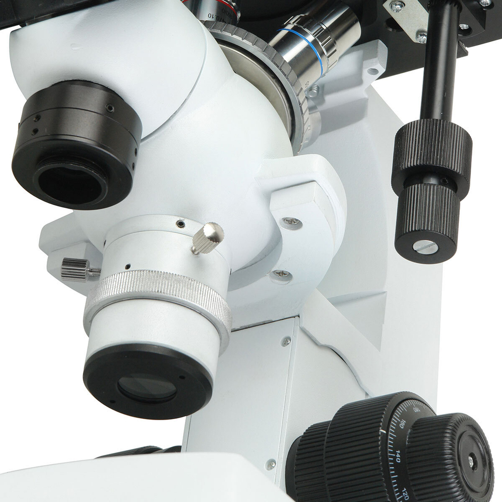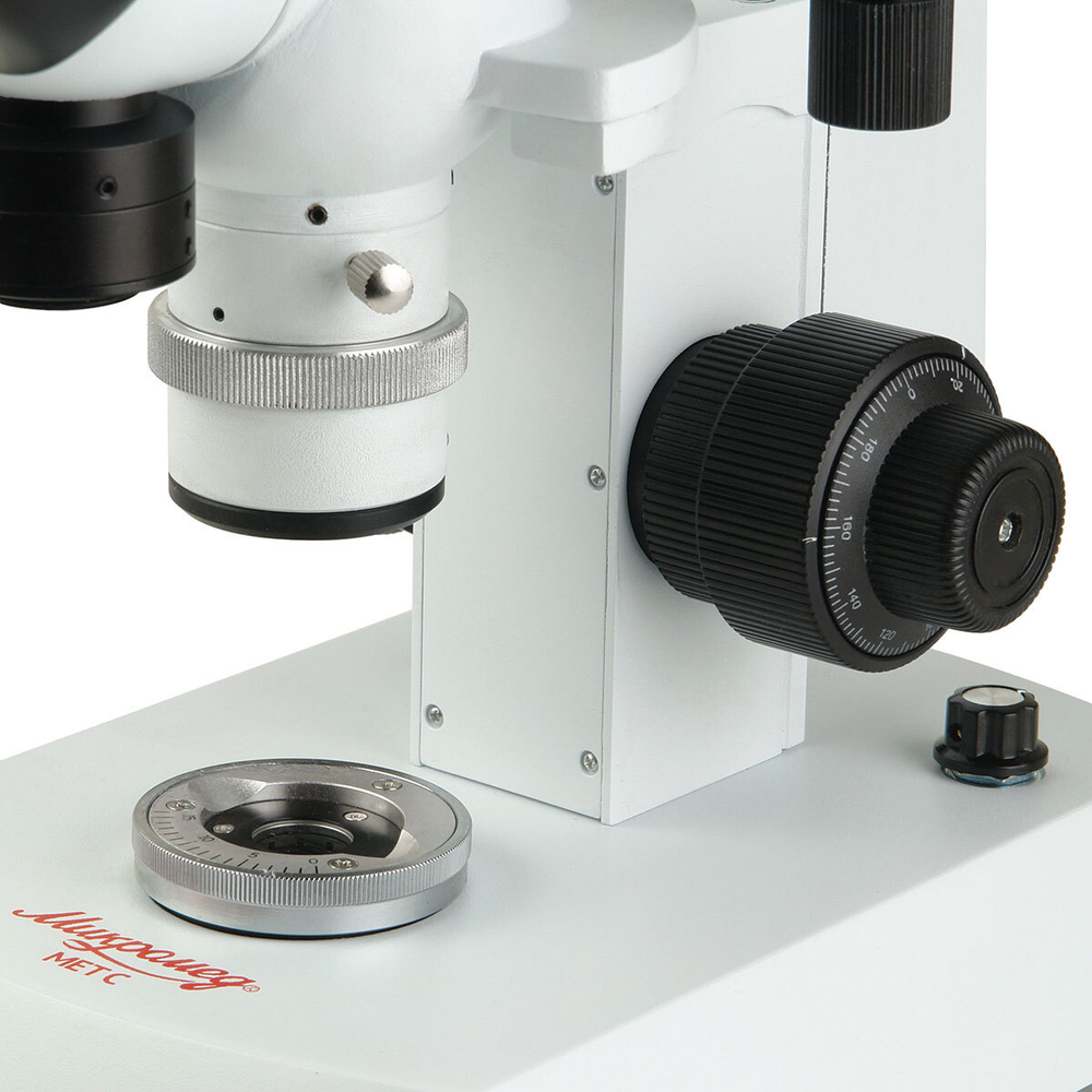 Микроскоп Микромед МЕТ С имеет систему прямого освещения предмета через объектив. Это позволяет создавать высокую интенсивность освещения в размер поля исследуемого участка предмета светом, падающим на предмет строго в вертикальном направлении. Это особенно важно для исследования полированных образцов в металлографии и петрографии. Осветитель отраженного света состоит из коллектора с регулируемой полевой диафрагмой и конденсора с регулируемой апертурной диафрагмой. Опак-иллюминатор направляет свет, отраженный от объекта, на окулярные тубусы, и одновременно направляет свет источника от конденсора через объектив микроскопа на объект исследования. В качестве источника света использован мощный 3-х ваттный светодиод с регулировкой яркости свечения. Блок питания светодиода встроен в основание микроскопа.