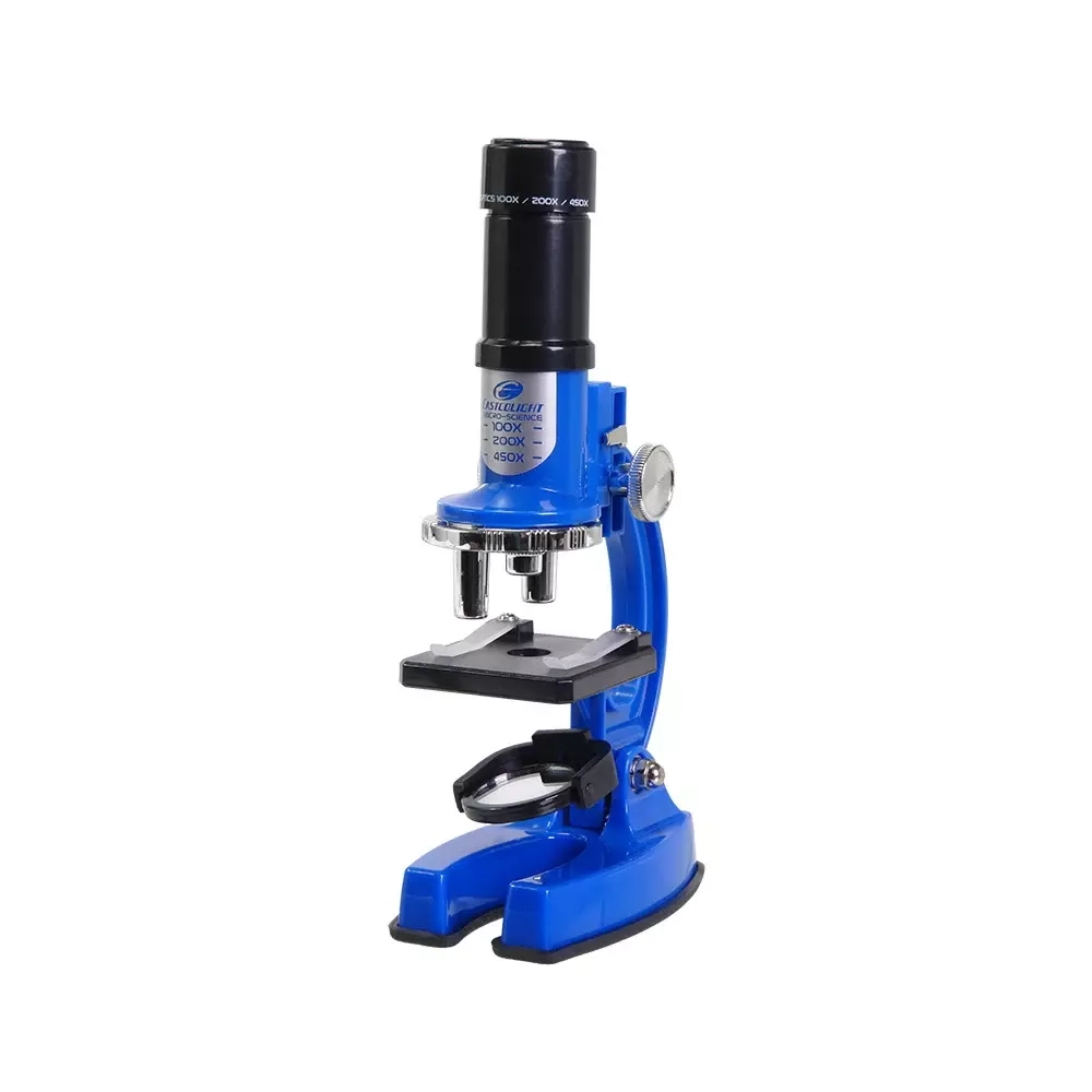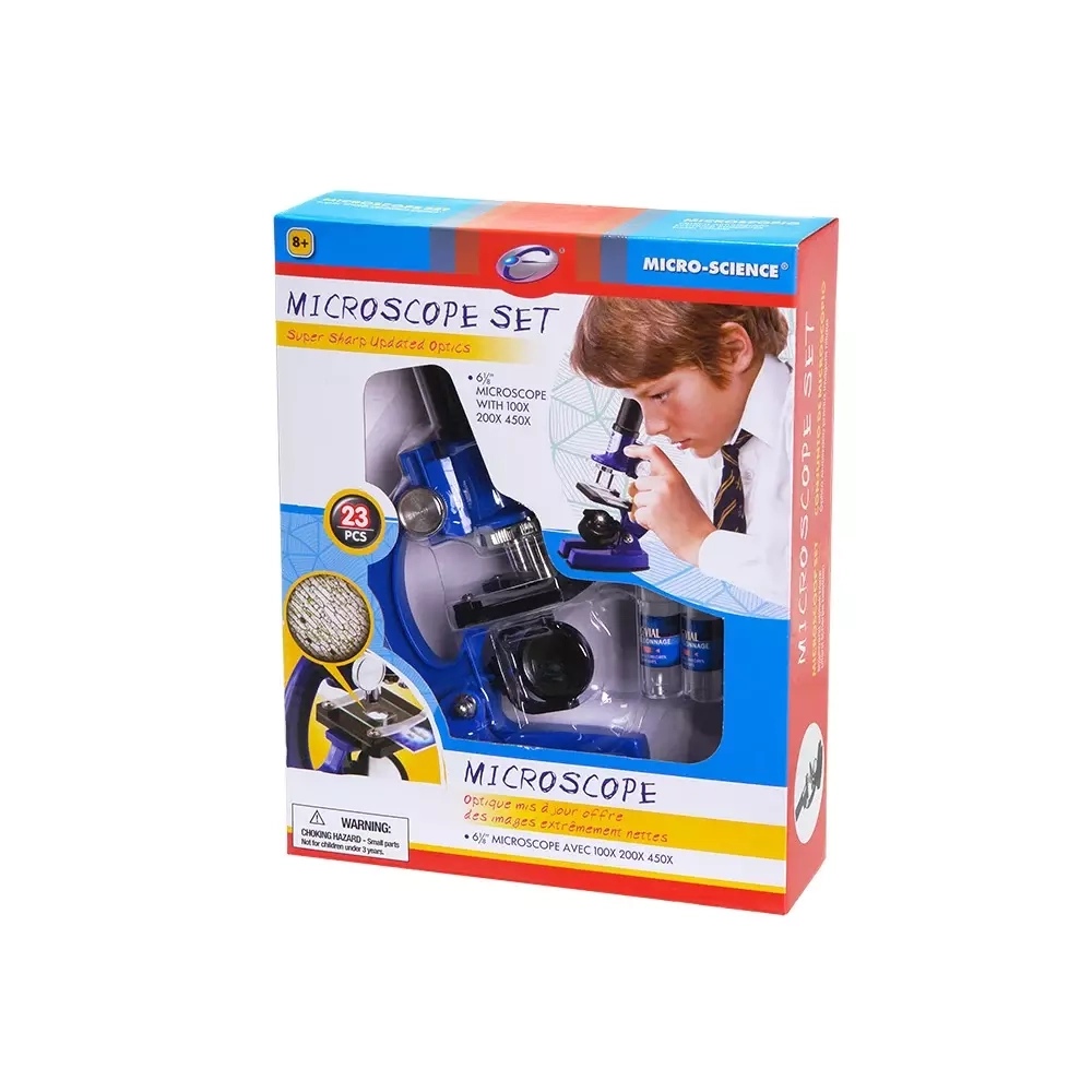 Монокулярный микроскоп, увеличение 100–450х, 3 объектива, источник света – зеркало, 4 чистых предметных и покровных стекла со стикерами, подготовленный микропрепарат в комплекте