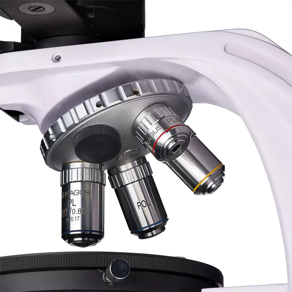 Револьвер рассчитан на установку пяти объективов. Так как в комплекте их четыре, то одно гнездо остается свободным – в него можно установить дополнительный объектив из линейки аксессуаров MAGUS. Объективы являются планахроматами, скорректированным на бесконечность и рассчитанными на покровное стекло толщиной 0,17 мм. Повернутый «от наблюдателя» револьвер позволяет видеть рабочий объектив, что удобно для пользователя. Гнезда револьверного устройства можно центрировать.