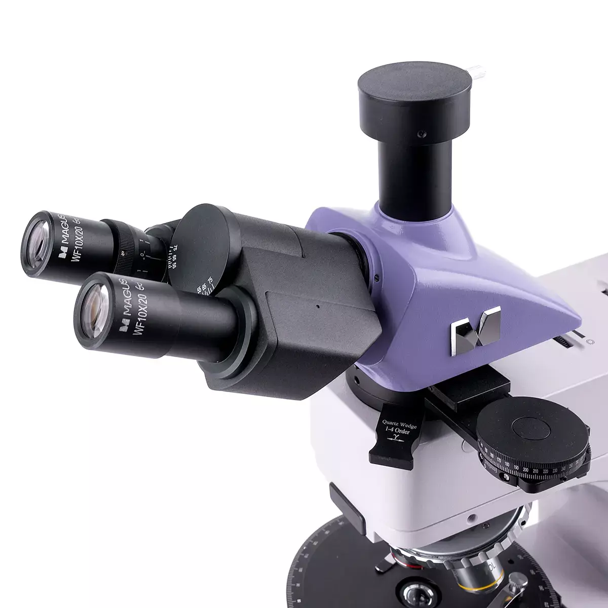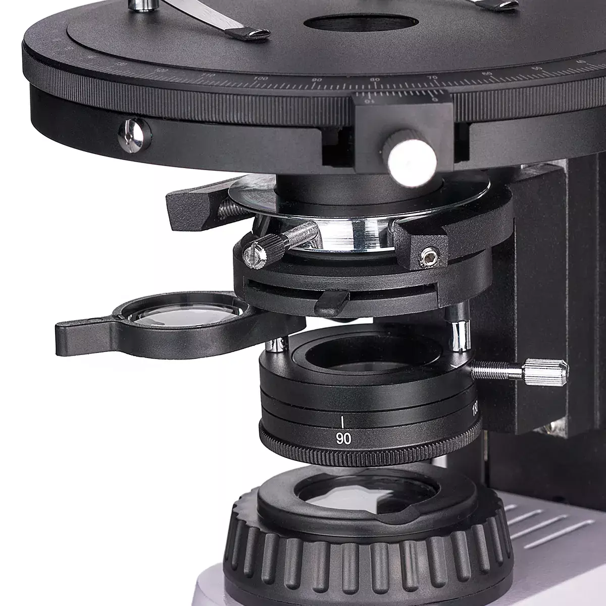 Промежуточная насадка встроенный анализатор, с переключением на обычный либо поляризованный свет, с вращением 0–360°; нониус для измерения углов с точностью до 0,1°; линза Бертрана; слот для установки компенсаторов