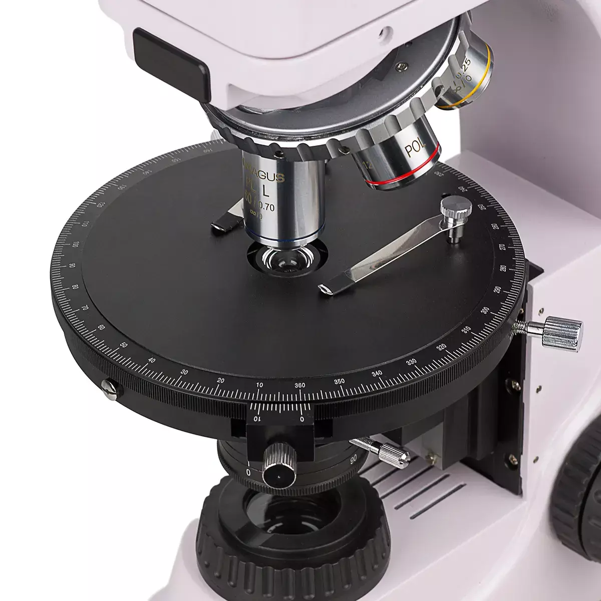 Предметный столик вращается, поэтому можно изменять преломление света внутри образца. Также столик может быть отцентрирован относительно оптической оси. На столике присутствуют отметки угла поворота и измерительная шкала.
