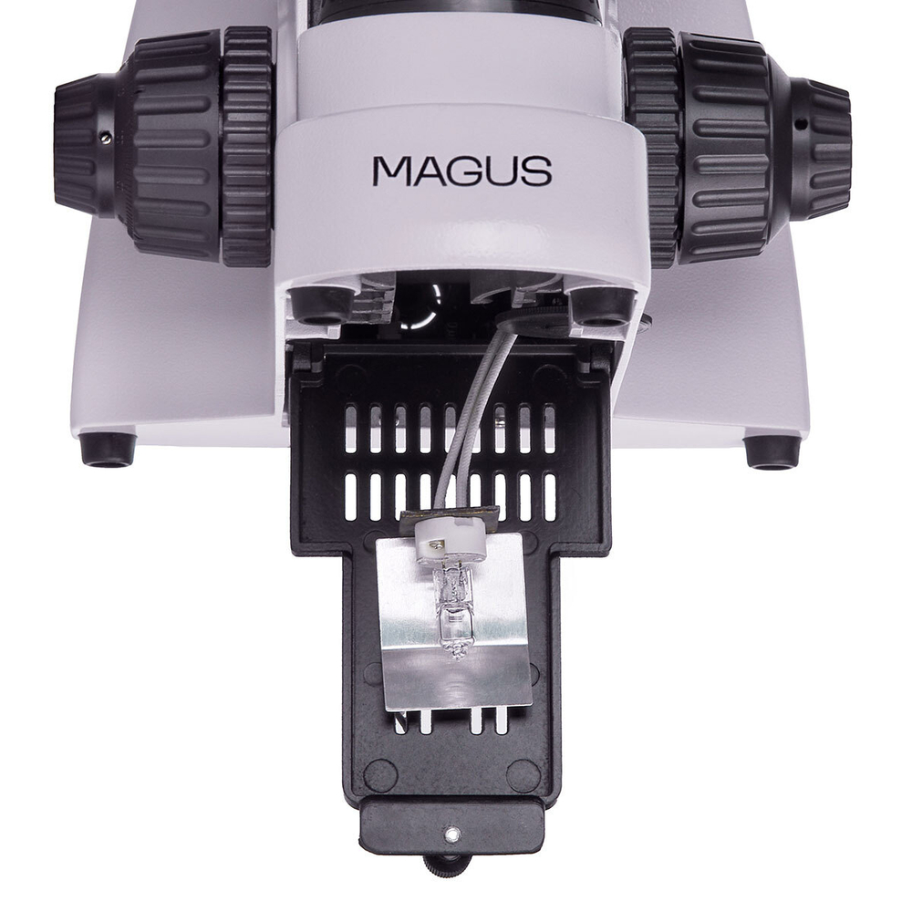 В осветителях отраженного и проходящего света стоят 30-ваттные галогенные лампы. Галогенные лампы излучают свет, комфортной для глаз цветовой температуры. 30-ваттная лампа светит достаточно ярко для работы на объективах увеличением от 4х до 100х в светлом поле и в поляризованном свете.