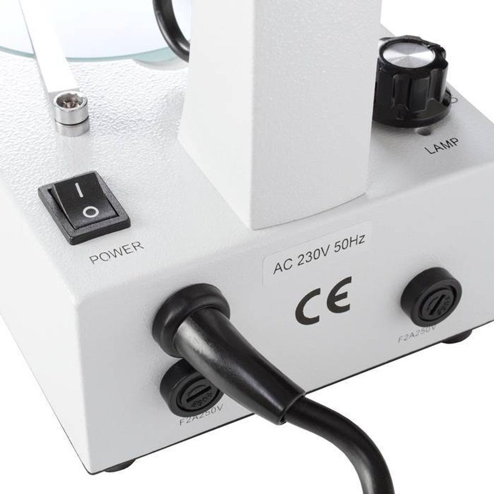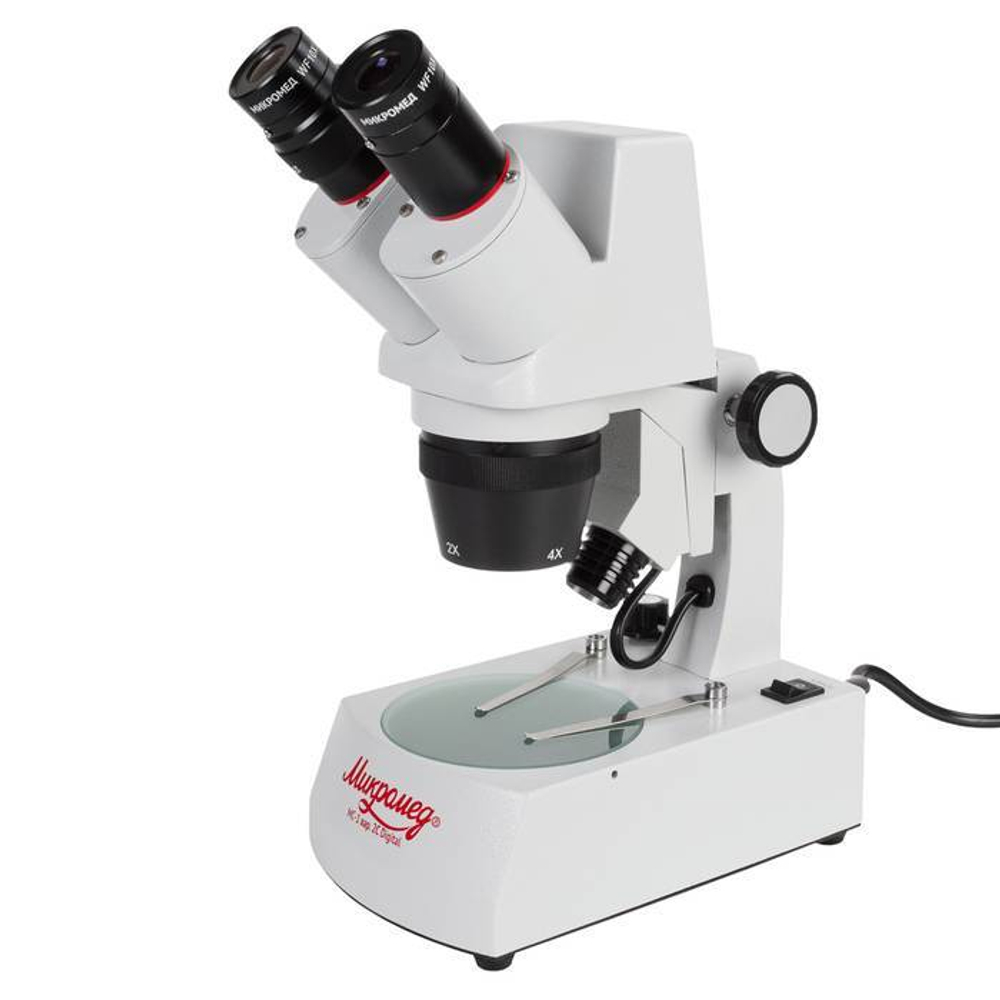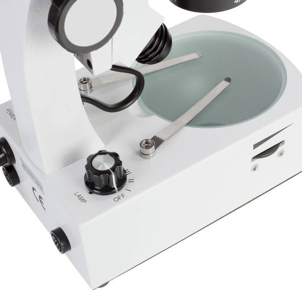 Стереомикроскоп предназначен для проведения исследований в отраженном и проходящем свете. Для подсветки предмета предназначены встроенные в его конструкцию осветители с низковольтными галогенными лампами. Осветитель отраженного света встроен в штатив и имеет линзовый коллектор в оправе, что позволяет получать яркой равномерное пятно в плоскости предмета. Осветитель проходящего света для обеспечения равномерности освещения снабжен матовым рассеивателем и встроен в основание. Блок питания осветителей расположен в основании микроскопа. При необходимости использовать дополнительный осветитель отраженного света, его можно выбрать из ассортимента дополнительных принадлежностей.