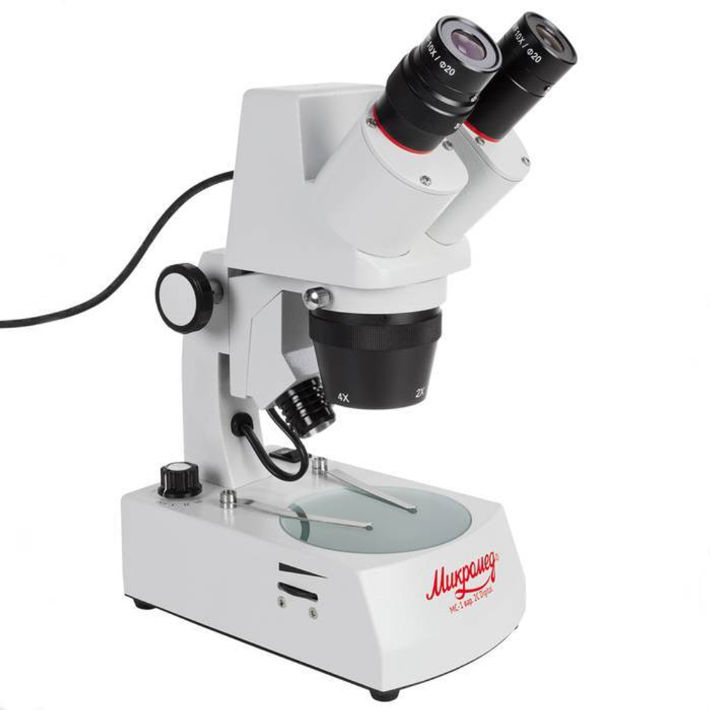 - Микроскоп имеет два фиксированных увеличения 20х и 40х.