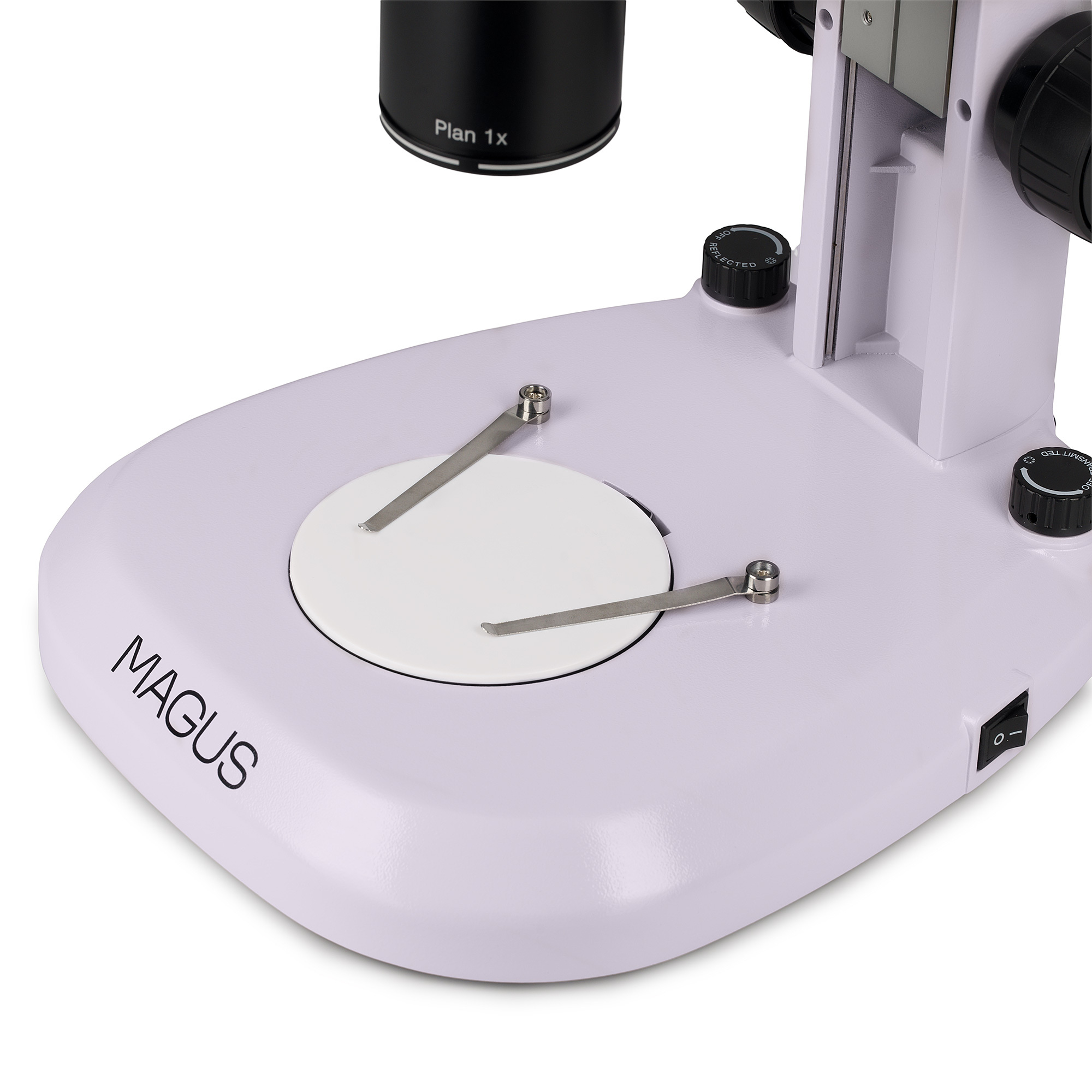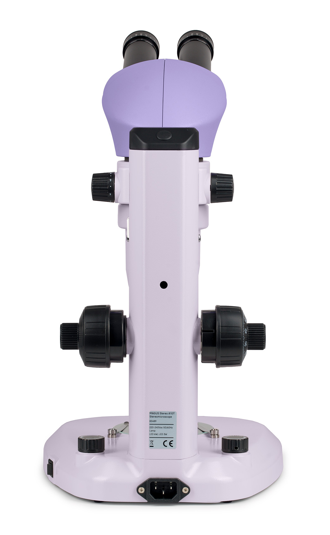 Стереомикроскоп Аббе имеет два оптических канала, которые соединяются в главном объективе. Начинаются они в окулярных тубусах. Модель MAGUS Stereo A10 оснащена бинокулярной визуальной насадкой, ее тубусы имеют наклон 20° над горизонтальной плоскостью – такое положение комфортно при продолжительных исследованиях. Система диоптрийной подстройки на тубусах не предусмотрена. В микроскоп можно установить цифровую камеру: для этого используйте промежуточную насадку с фотовыходом и адаптер C-mount.