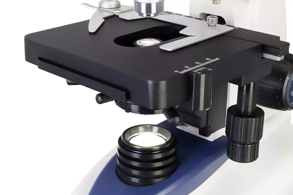На предметном столике расположен препаратоводитель, под столиком находится конденсор Аббе. Световой поток от нижнего осветителя регулируется при помощи ирисовой диафрагмы, также при наблюдениях можно использовать светофильтры. Подсветка – только нижняя и представляет собой светодиод с регулировкой яркости. Настройка резкости производится и грубо, и точно.