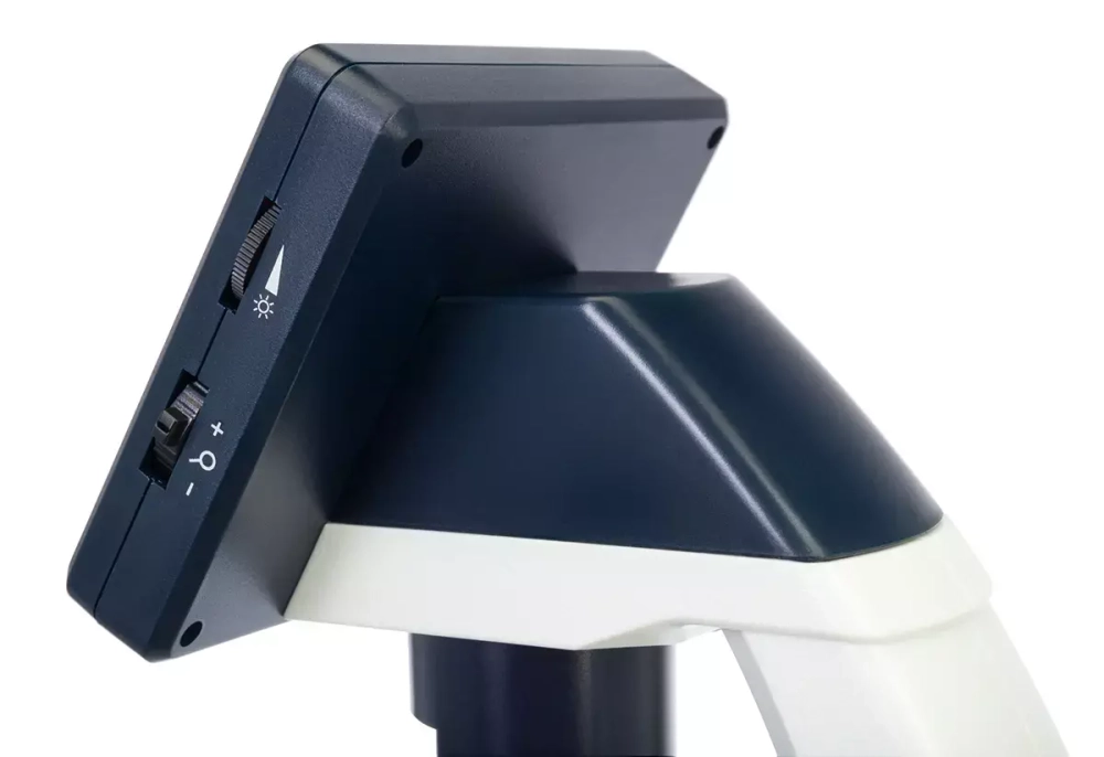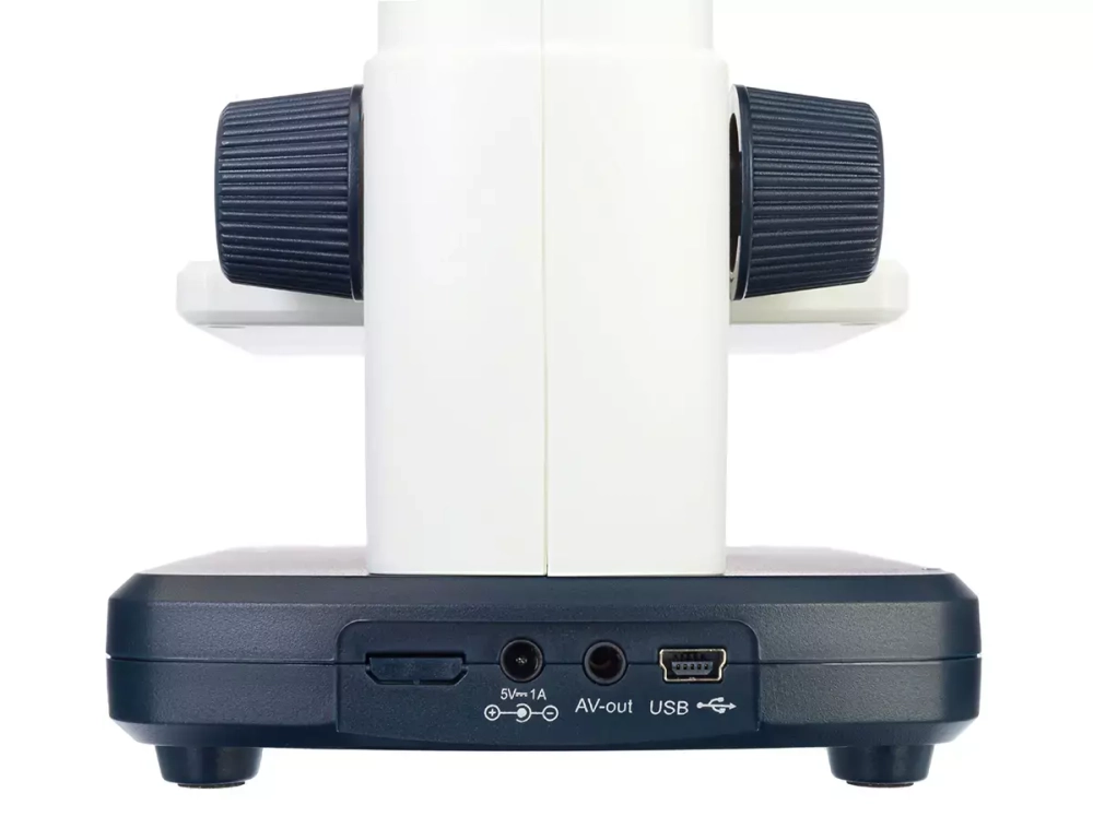 Изображение с объектива камеры выводится на экран микроскопа в режиме реального времени. Подключение к компьютеру осуществляется через кабель USB, а подключение к телевизору – через кабель AV. При наблюдениях образец помещается на предметный столик, который дополнен двумя металлическими зажимами и измерительными шкалами. Фокусировку можно выполнять в пределах от 0 до 150 мм. Подсветка расположена вверху. Питается микроскоп от встроенного аккумулятора или от сети переменного тока (кабель с адаптером в комплекте).