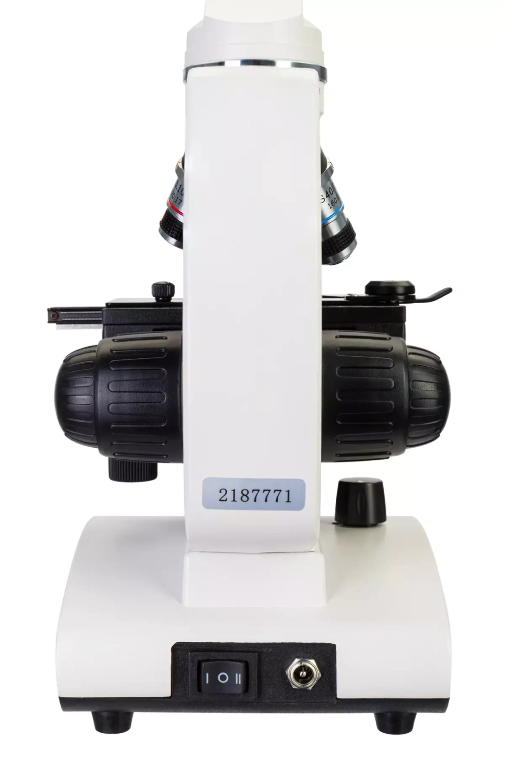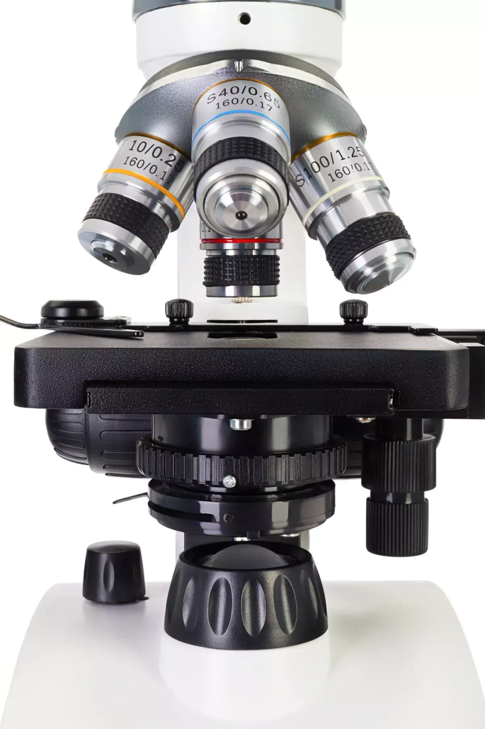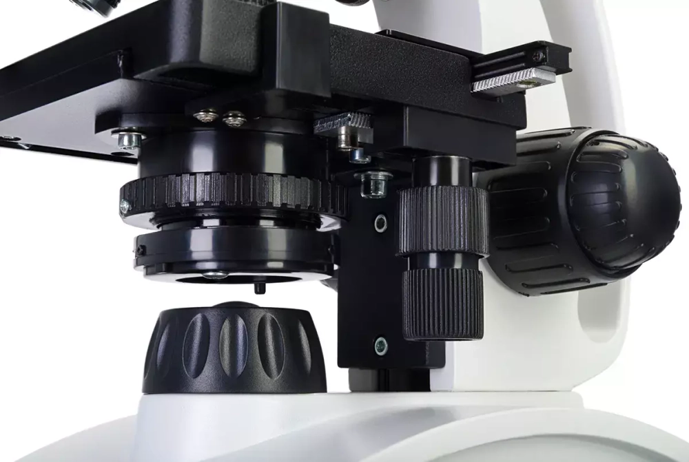 Предметный столик можно перемещать, также он дополнен препаратоводителем. Под столиком находится конденсор Аббе с ирисовой диафрагмой и держателем фильтра. Подсветка состоит из верхнего и нижнего светодиодов, яркость которых можно регулировать. Питание – сеть переменного тока или батарейки. Адаптер питания уже в комплекте.