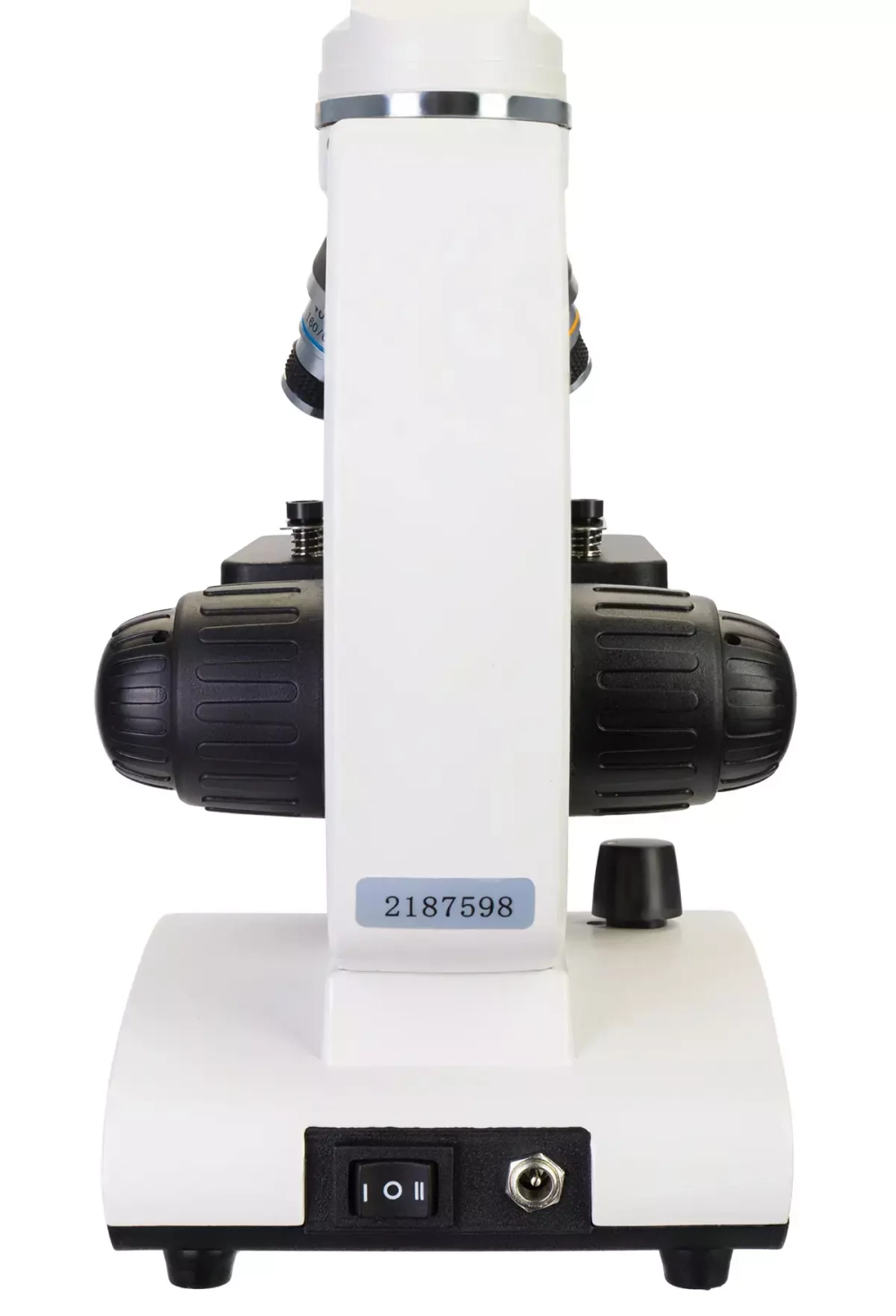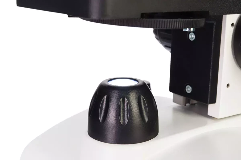 Оптика микроскопа сделана из стекла, поэтому передаваемая картинка четкая и контрастная. Три ахроматических объектива дают увеличения 4х, 10х и 40х. 40-кратный объектив подпружинен. Широкопольный окуляр приближает в 10 раз. Общая кратность микроскопа составляет от 40 до 400 крат. Монокулярная насадка отклонена на угол в 45°, что делает более комфортными длительные наблюдения. Также насадку можно вращать на 360° – эта функция полезна при групповых исследованиях, так как позволяет показывать образец другому исследователю без перемещения микроскопа (нужно лишь повернуть насадку в нужную сторону). Отметим, что настраивать резкость можно не только грубо, но и точно.