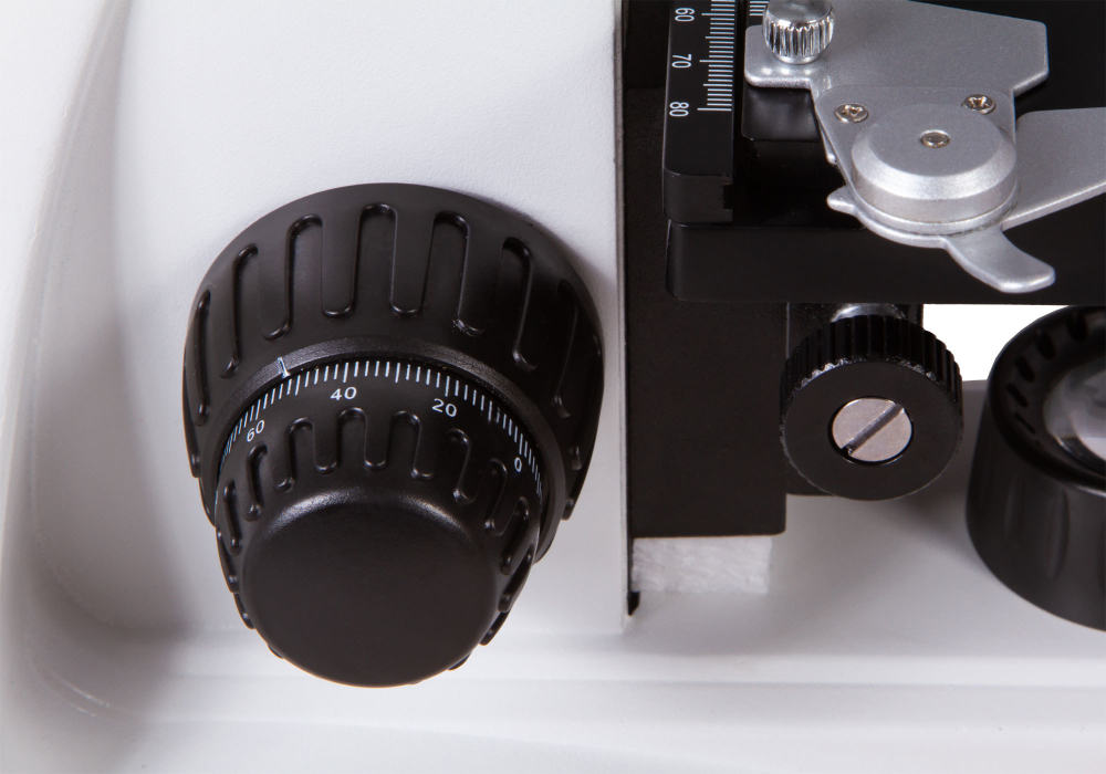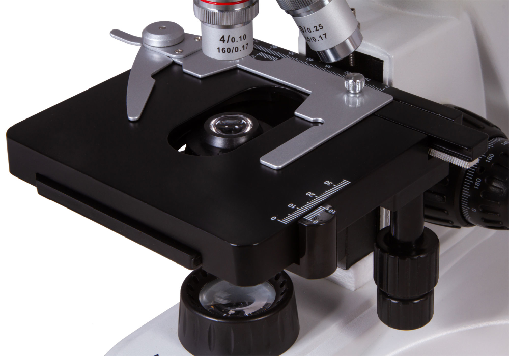 Микропрепараты устанавливаются на двухкоординатный предметный столик, под которым находится яркая светодиодная подсветка. Также под ним расположен конденсор Аббе с ирисовой диафрагмой и держателем фильтра. Рядом есть ручки грубой и точной фокусировки. Яркость подсветки регулируется. Для питания подсветки требуется подключение к сети переменного тока.