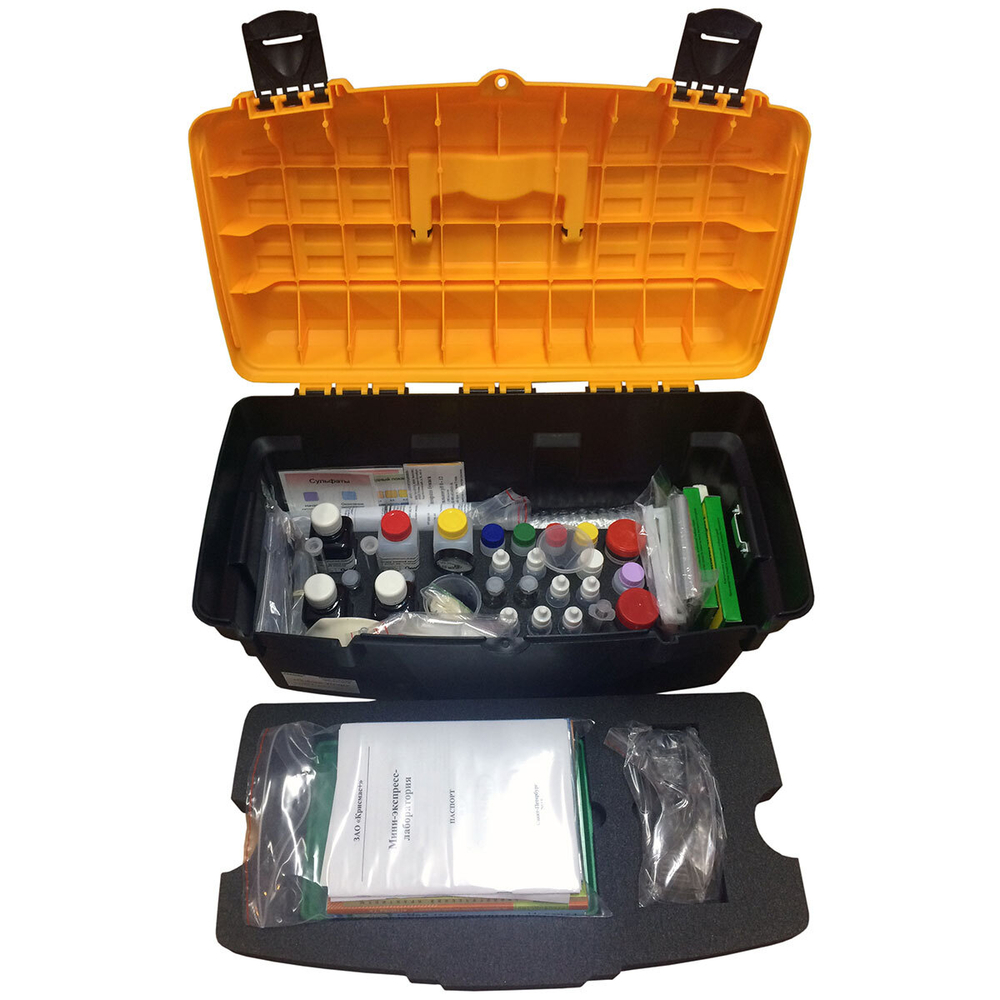 Учебная мини-экспресс лаборатория учебная, 14 показателей с комплектом пополнения при иллюстрации химических аспектов различных образовательных курсов (химии, биологии, экологии, географии, ОБЖ, геоэкологии, экологической химии и др.), содержательно связанных с влиянием показателей окружающей среды на живые организмы и экологические процессы и допускающих практическую исследовательскую работу.