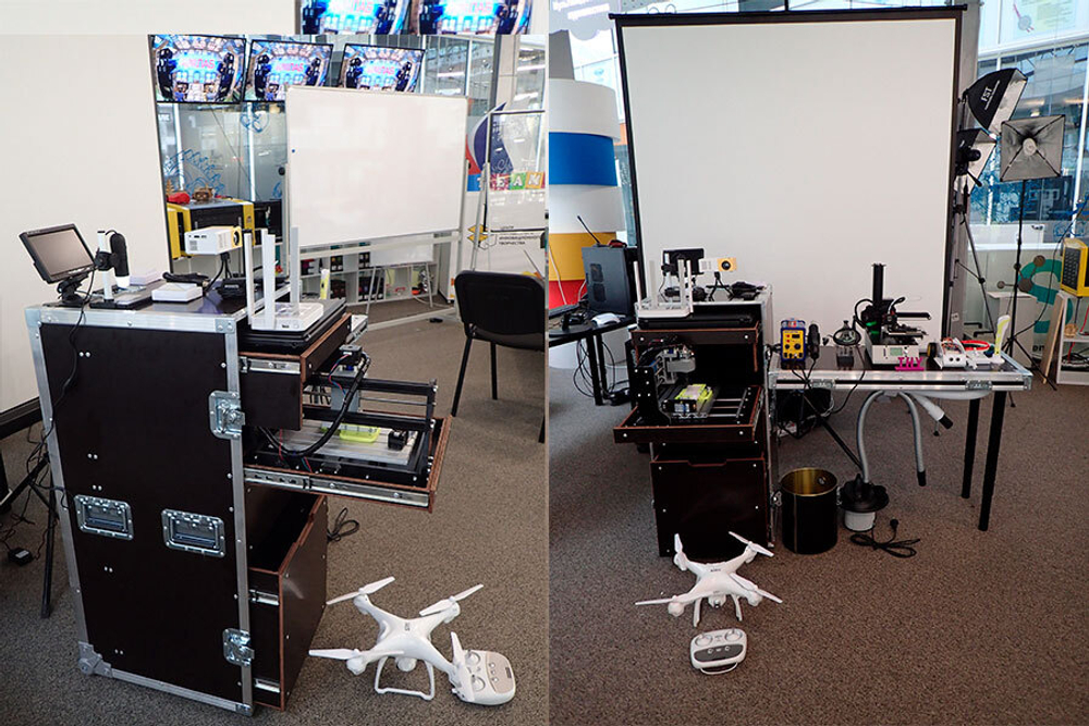 Мобильная лаборатория компетенций «Чемодан УДИВИ!» («UDV!-Bag» / U-united D-digital V-vehicle) – набор компактных версий качественного оборудования и станков с учебными материалами для изучения 16 актуальных современных компетенций.