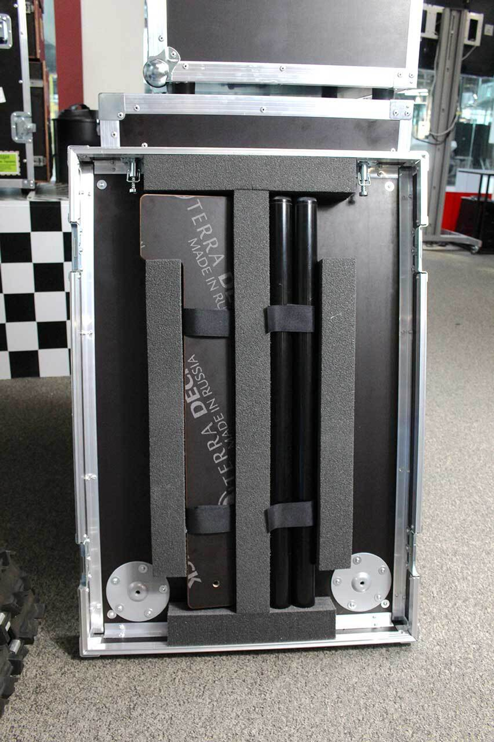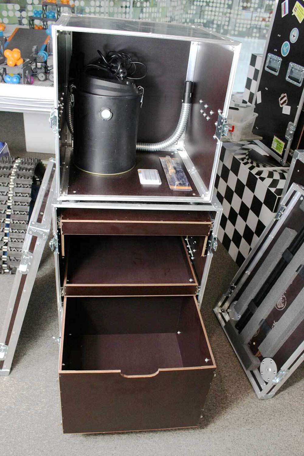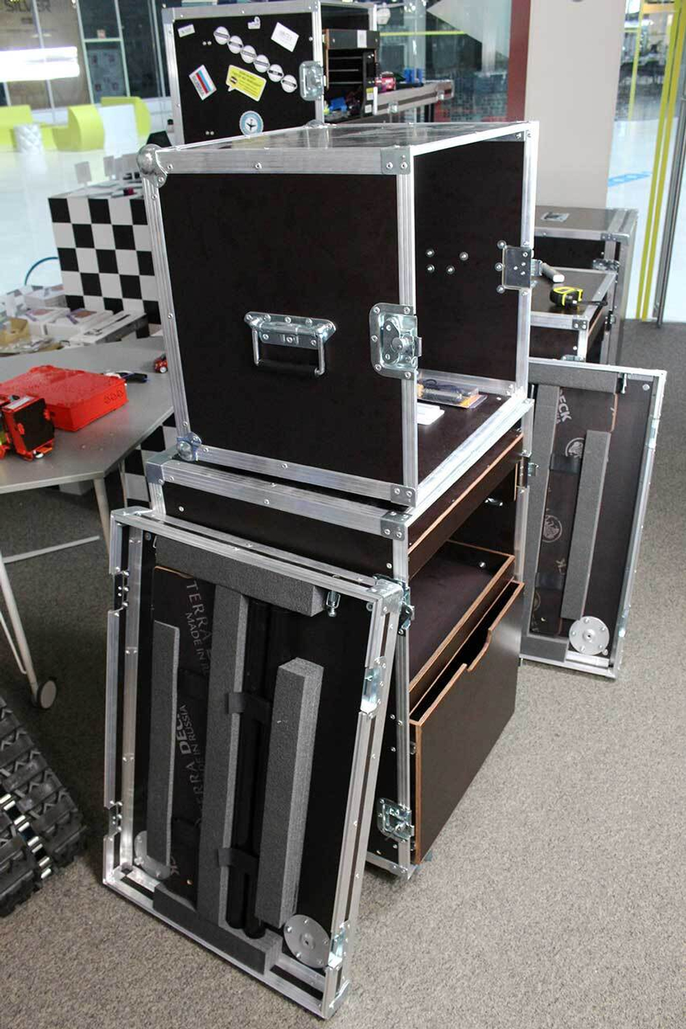 Сам чемодан представляет собой кофр-трансформер из ламинированной фанеры и металла, на платформе с колёсами. Внутреннее пространство разделено на 4 отсека для удобства тематического распределения материалов и оборудования. На время работы с оборудованием и станками кофр может трансформироваться в рабочую зону (стол) с вытяжной системой.