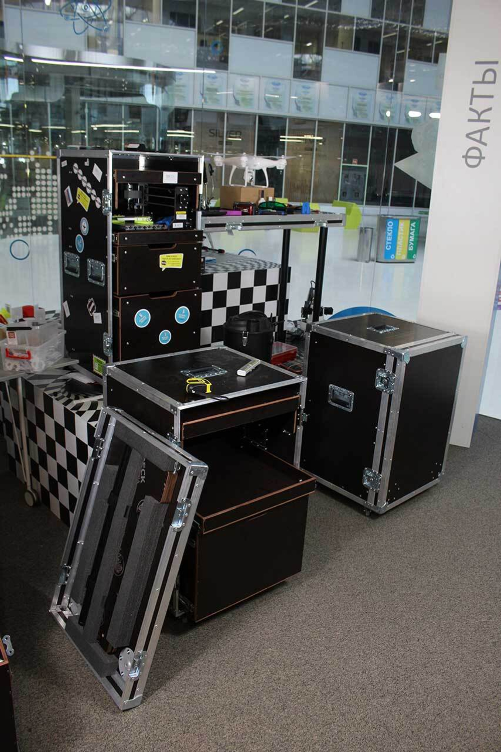 В составе мобильной лаборатории все необходимое для 30 школьников, реализующих различные технические задания и проекты. В набора входит более 300 часов учебно-методических материалов и комплексов, а также сценариев мероприятий, способных обеспечить необходимое вовлечение и интерес любой аудитории к изучаемым компетенциям и выполняемым работам как на 1-2 часа, так и до 30 часов реальной проф. подготовки.