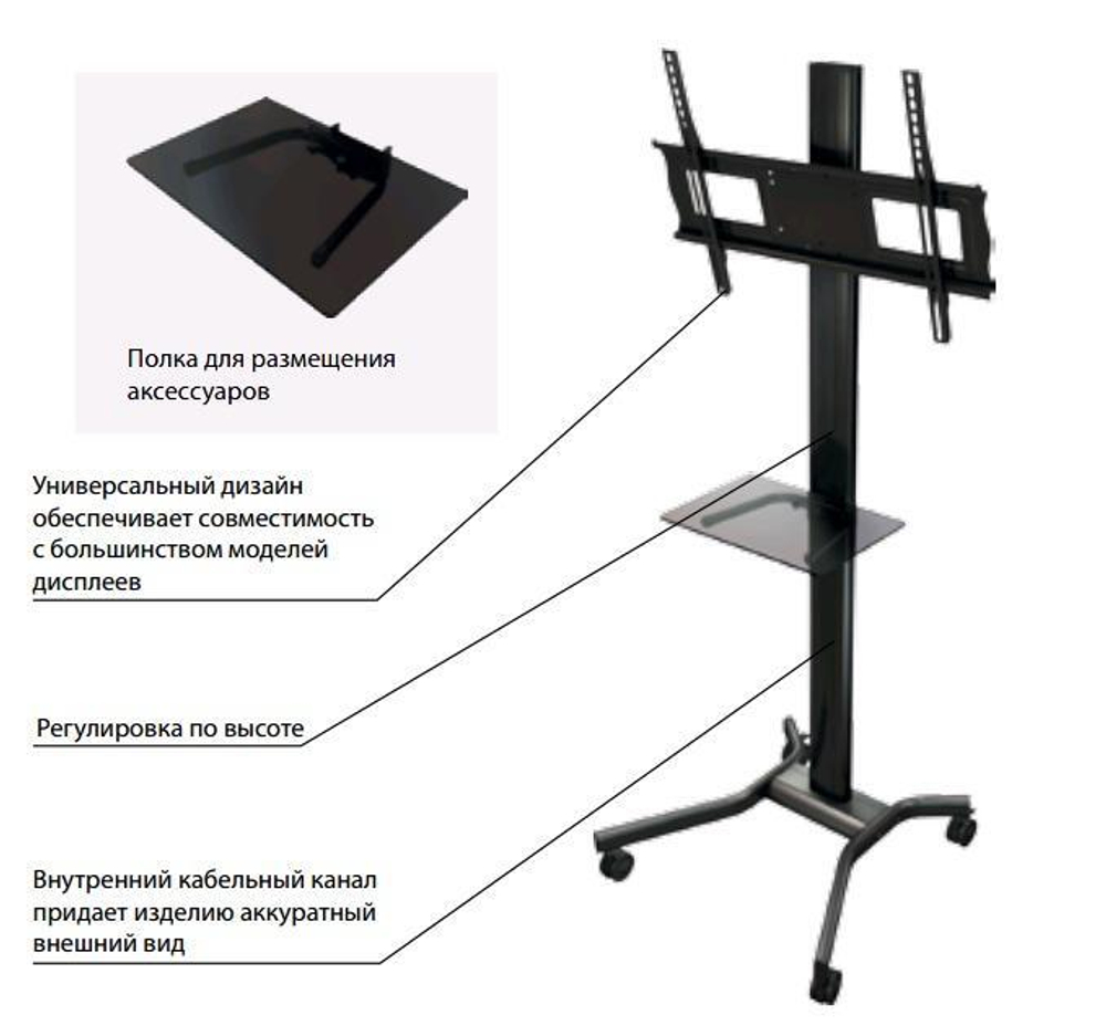 Прочные каучуковые колеса обеспечивают легкое перемещение по любой поверхности. Вертикальная регулировка, наклон на +15/-5° и поворот на +/-6° обеспечивает оптимальную высоту просмотра и угол обзора.