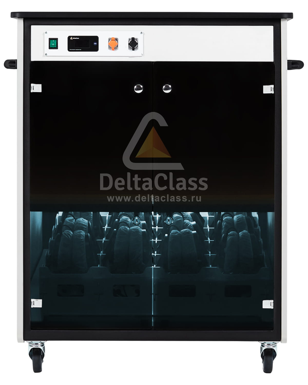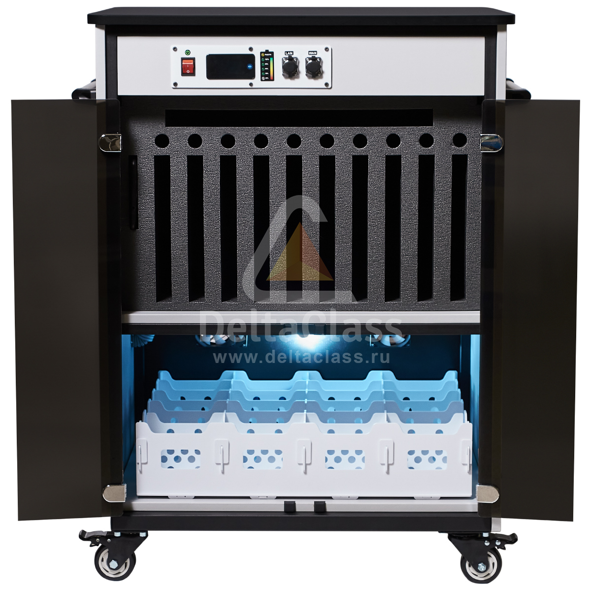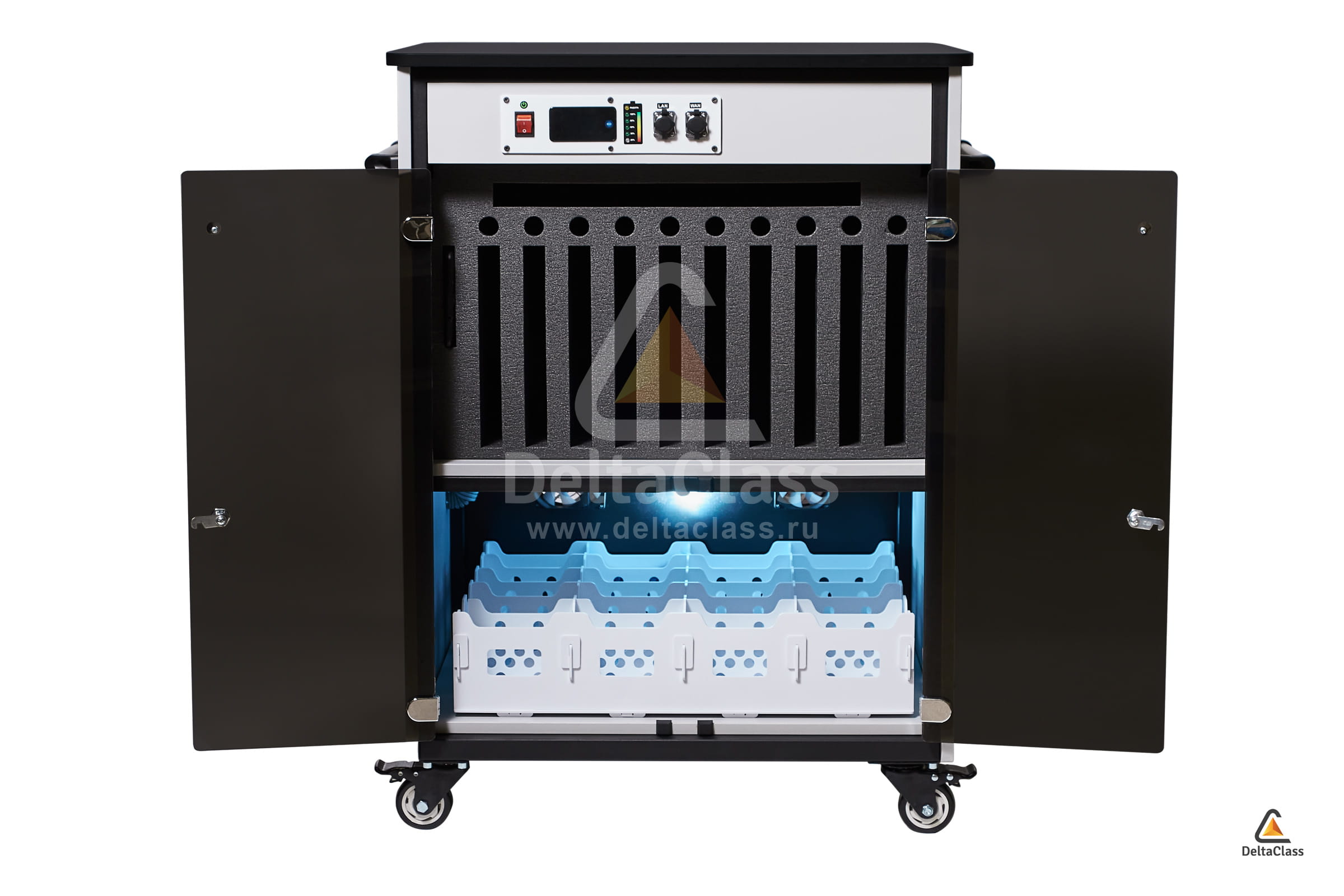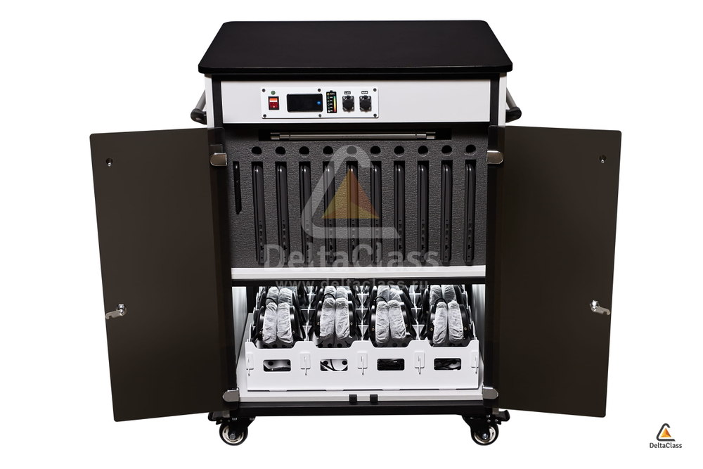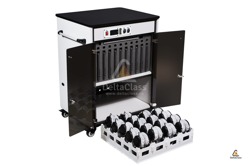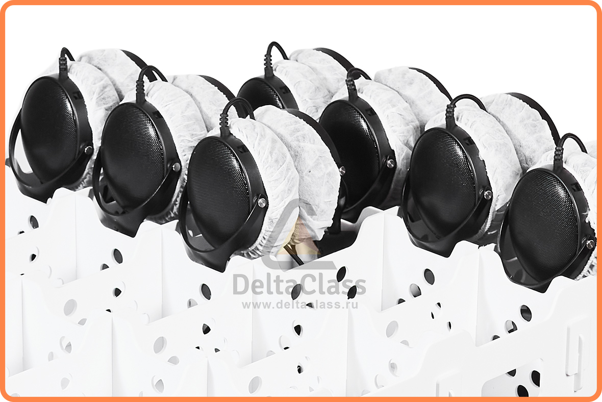 Для размещения лингафонных гарнитур в мобильной станции DELTACLASS CONNECT применяется многофункциональный лоток с перфорированными ячейками. Многофункциональный лоток изготовлен из непрозрачного пластика, устойчивого к бактерицидному электромагнитному излучению ультрафиолетового диапазона. Отсек для лингафонных гарнитур оснащен бактерицидным ультрафиолетовым излучателем для обеззараживания поверхностей амбушюр и микрофонов.
