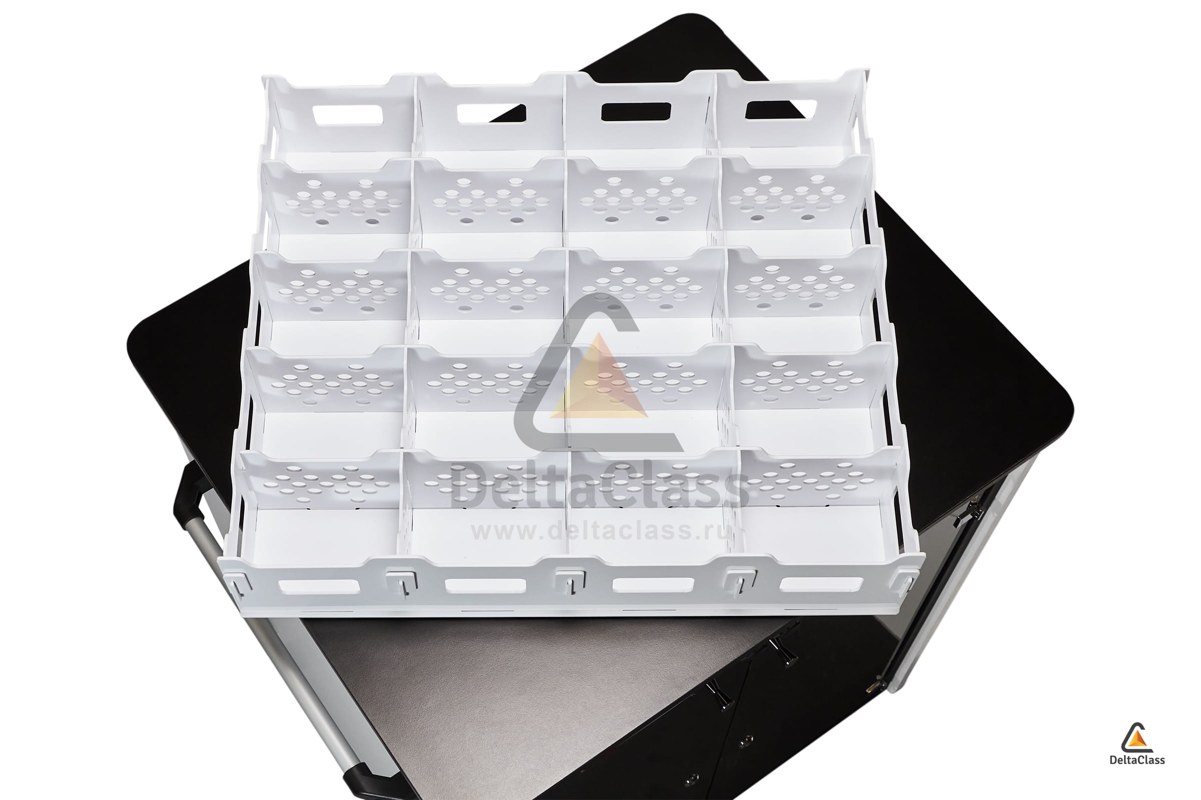 Для размещения ноутбуков в мобильной станции DELTACLASS CONNECT мы используем специальный мягкий ложемент из вспененного полиэтилена. Этот полимер является наиболее плотным среди других полиэтиленовых материалов и обладает высокими эксплуатационными показателями. Высокоточное изготовление на современных лазерных станках обеспечивает идеальную геометрию ячеек для ноутбуков. Ноутбуки не царапаются при извлечении, дольше сохраняют презентабельный внешний вид и защищены от вибраций при транспортировке.