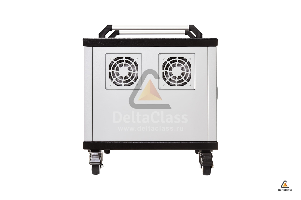 Активная система вентиляции мобильных станций DELTACLASS MODULE - это встроенный климат-контроль. Показания датчиков температуры передаются на ЭБУ, и при достижении заданного значения включаются вытяжные вентиляторы. Нагретый адаптерами питания и батареями планшетов воздух через каналы выбрасывается наружу. После того как температурные показатели возвращаются к нормальным значениям, ЭБУ отключает вентиляторы. Значения температур устанавливаются в зависимости от многих факторов, в т.ч. региональных климатических.