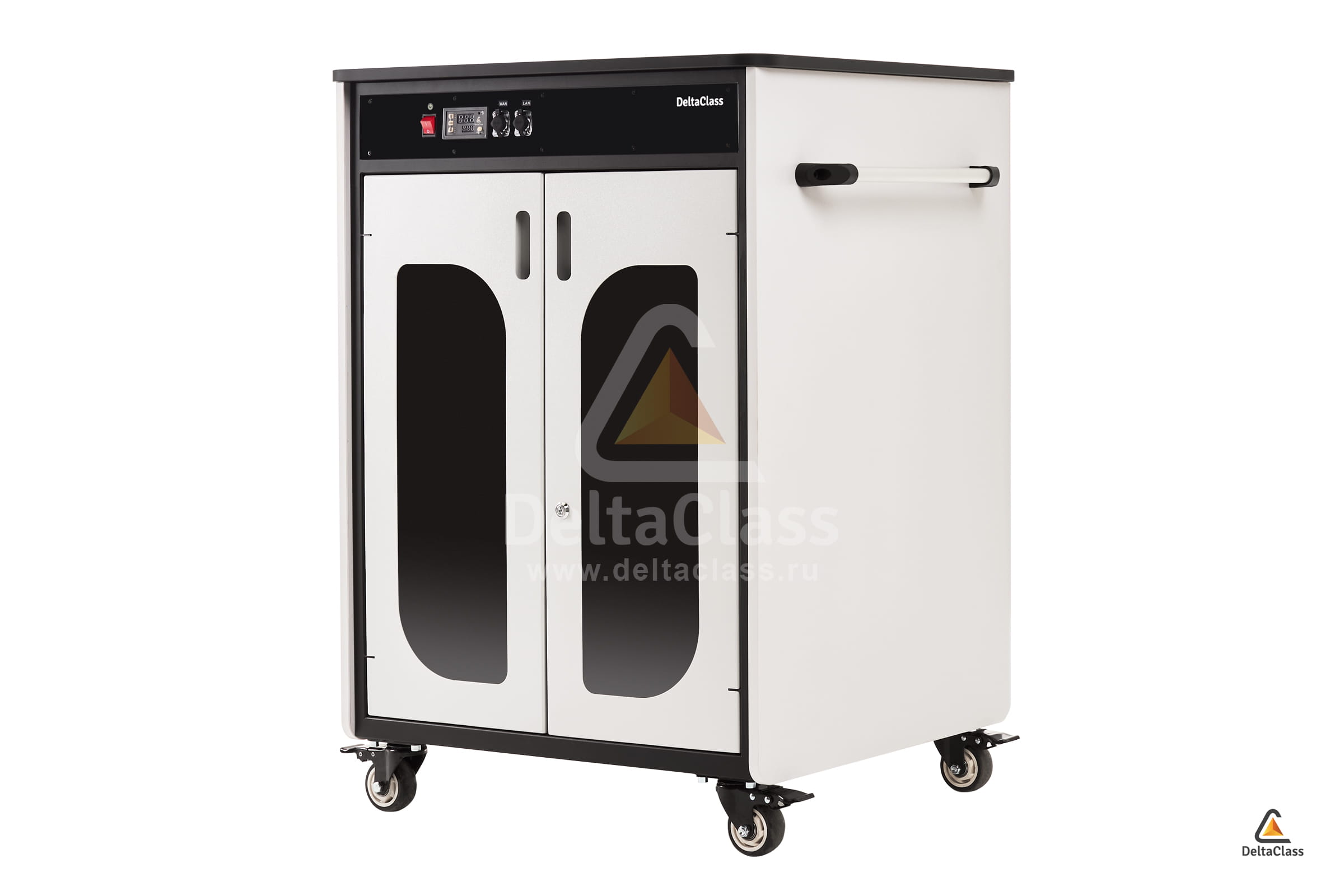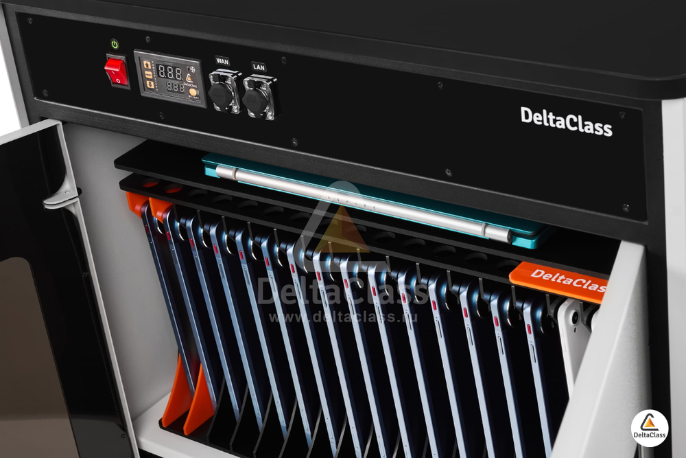 В мобильных станциях DELTACLASS установлена активная система вентиляции с функцией климат-контроля. Тёплый воздух, образующийся при работе зарядных блоков и аккумуляторов планшетов, отводится наружу по специально спроектированным каналам, а свежий поток поступает внутрь через вентиляционные отверстия технического отсека. После достижения заданной температуры контроллер автоматически останавливает работу вентиляторов, а параметры срабатывания можно настроить с учётом климатических условий региона и особенностей эксплуатации.