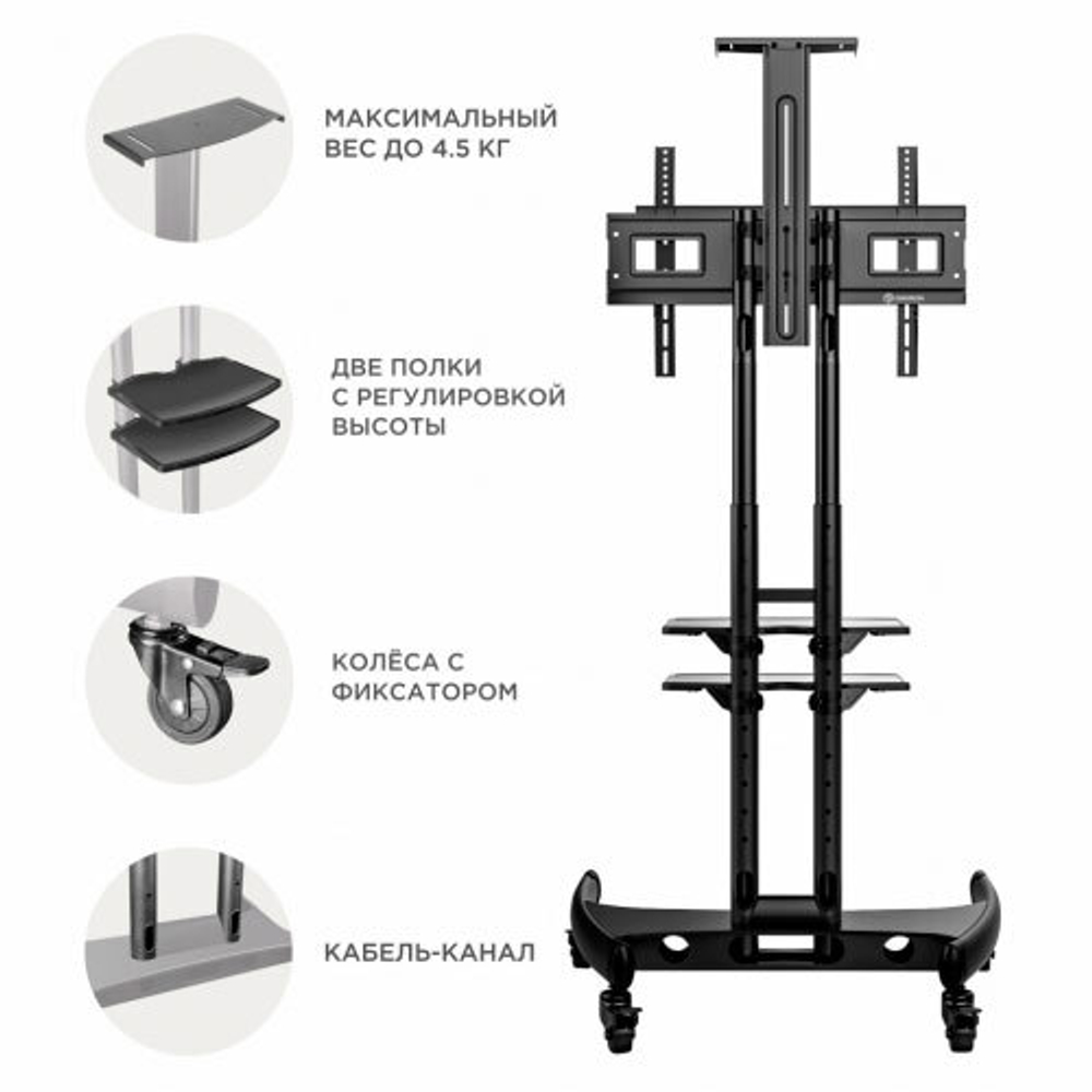 Тормоза, встроенные в колесики, помогают надёжно зафиксировать стойку и избежать случайного перемещения.