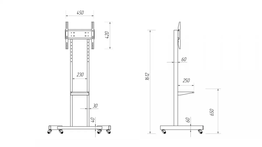 Для удобного перемещения по аудитории стойка оснащена колесиками с фиксаторами, а так же полкой для размещения дополнительного оборудования или учебных материалов.